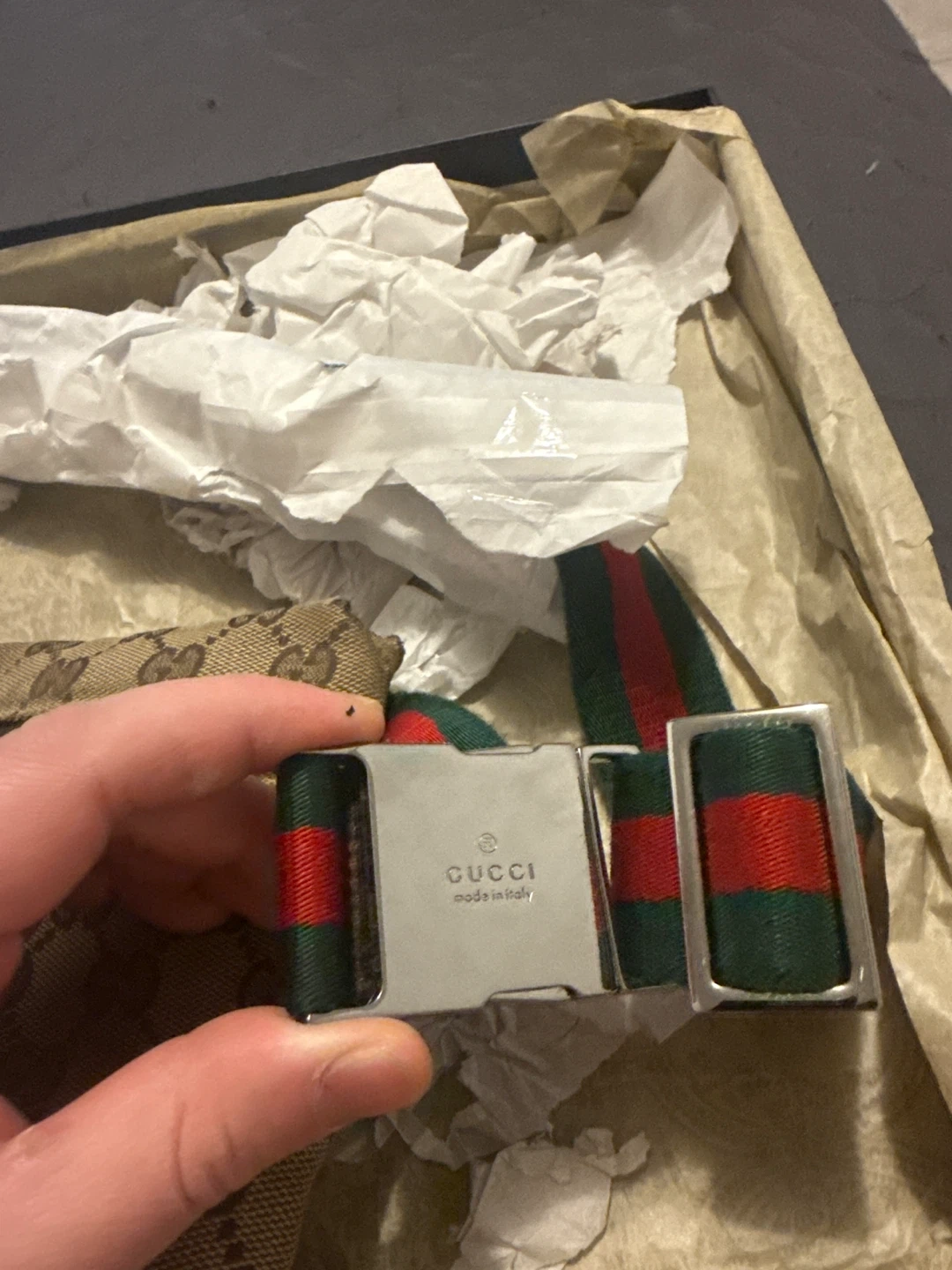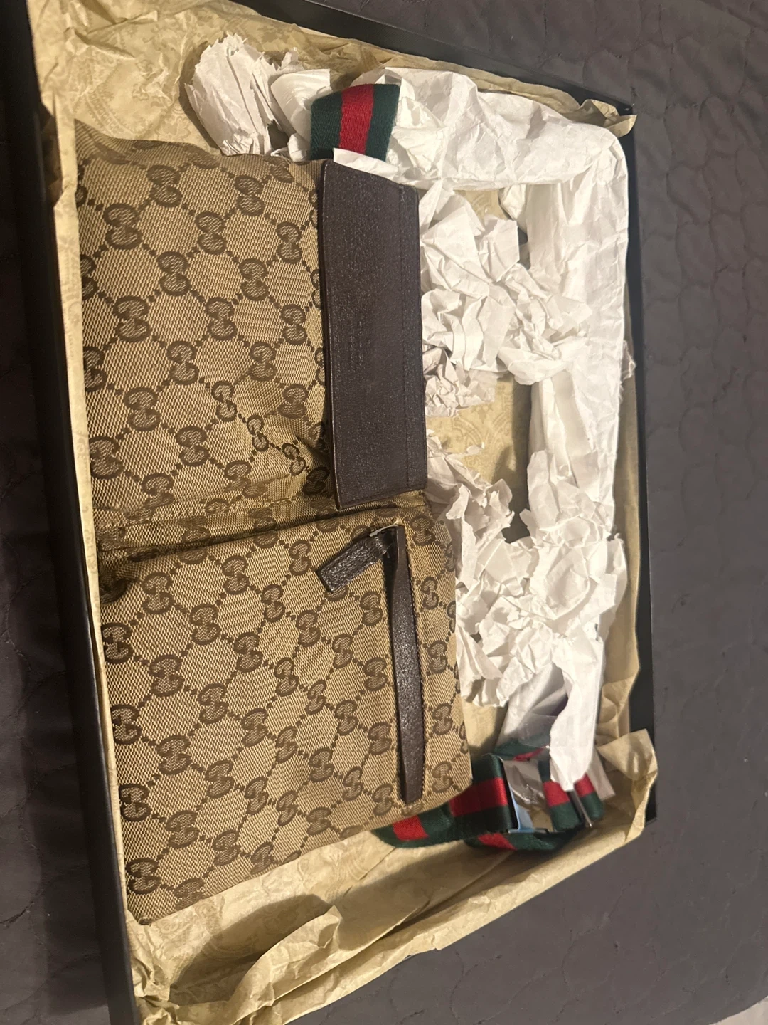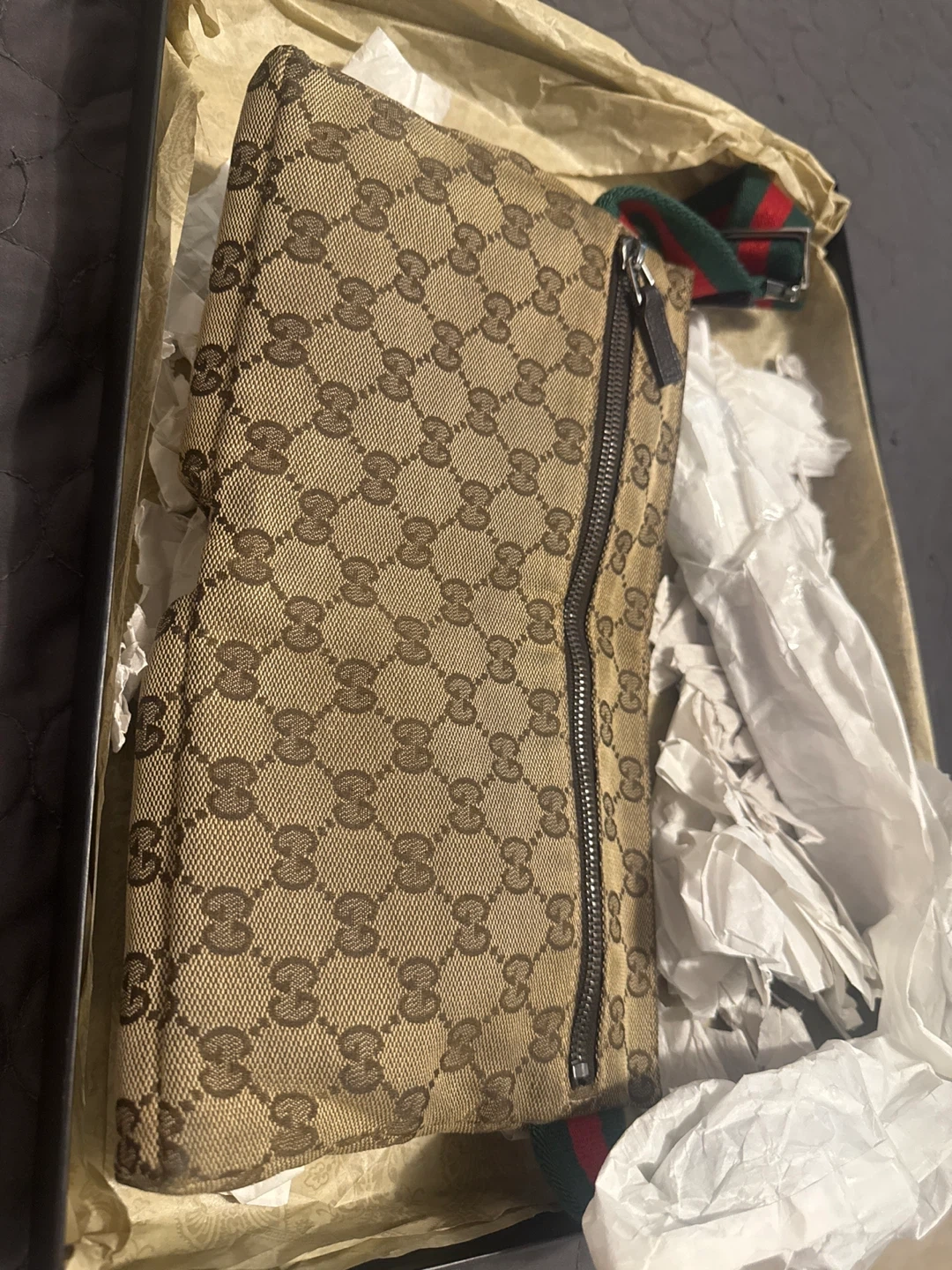 Selling a Gucci belt bag! It comes with the original box. The bag features the classic Gucci pattern and the iconic green and red stripe on the belt. It's in great condition and ready for a new home