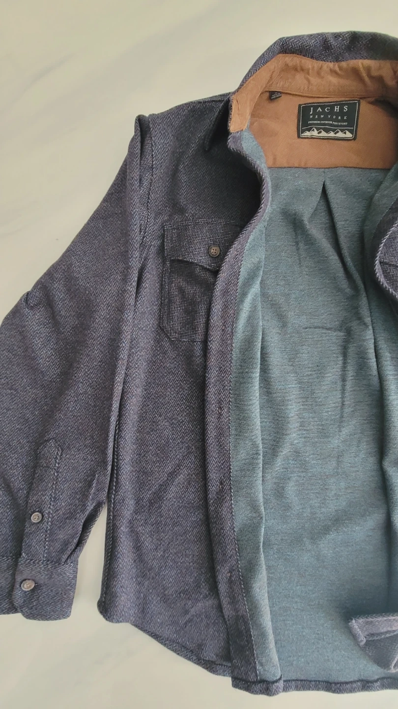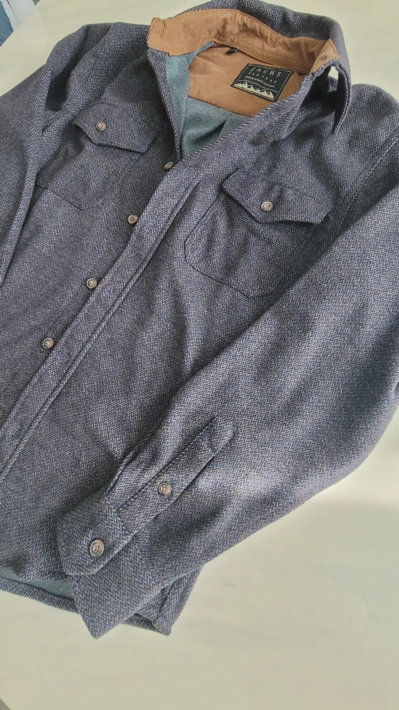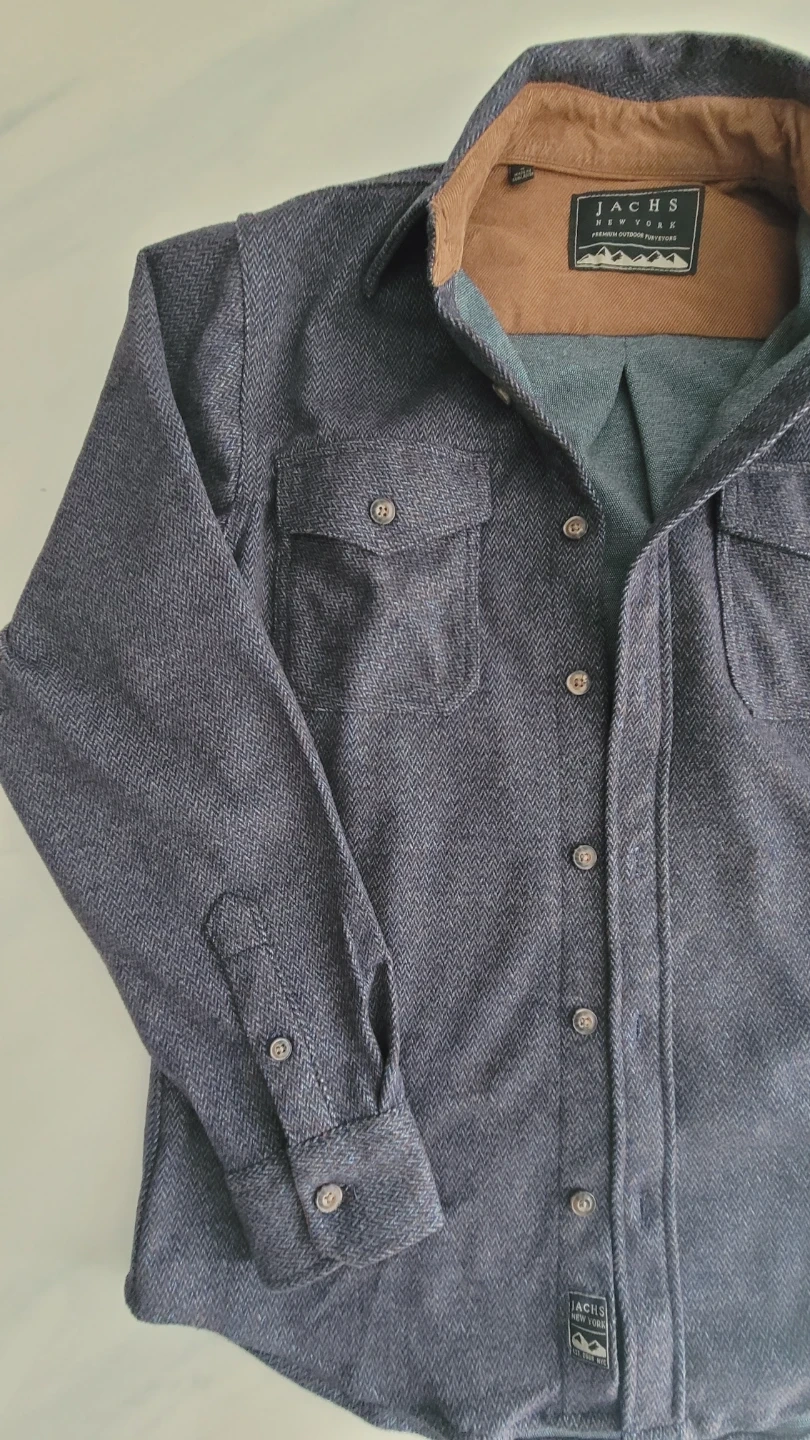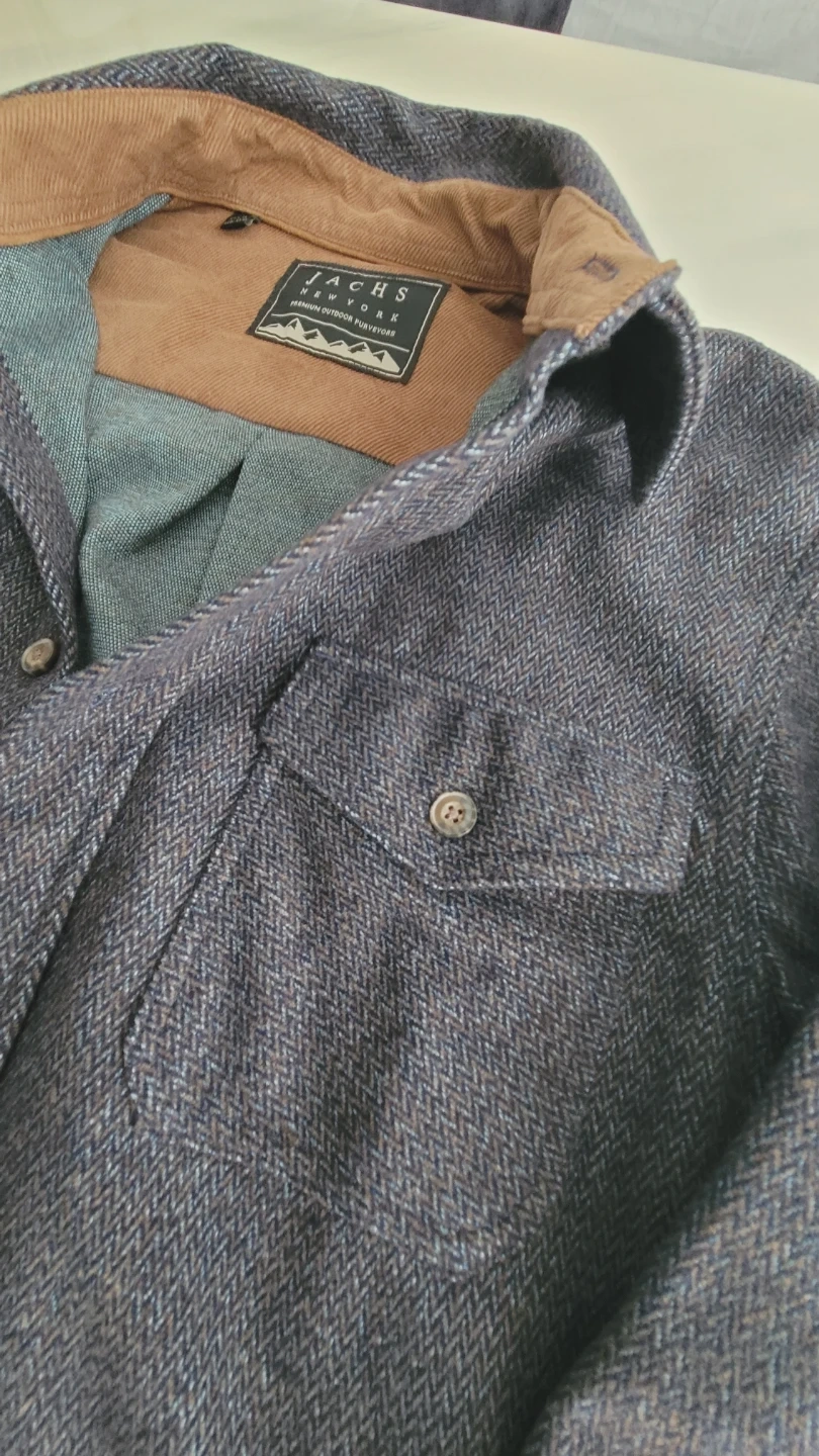 This Jachs NY shirt jacket features a classic herringbone pattern. It has a cozy corduroy collar and two chest pockets. Perfect for layering on cooler days!