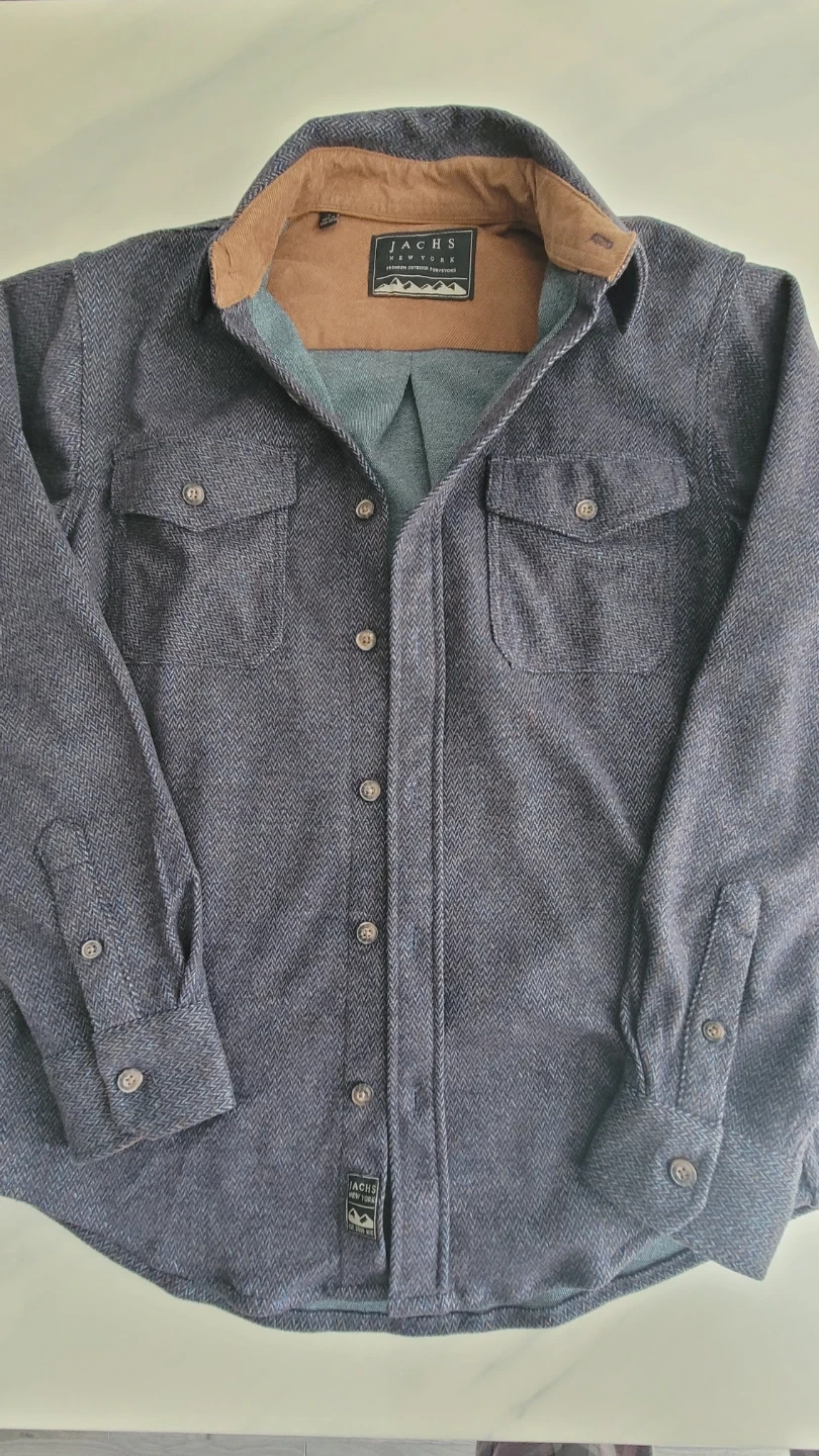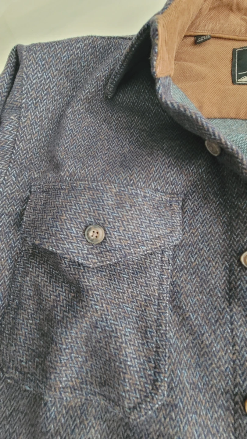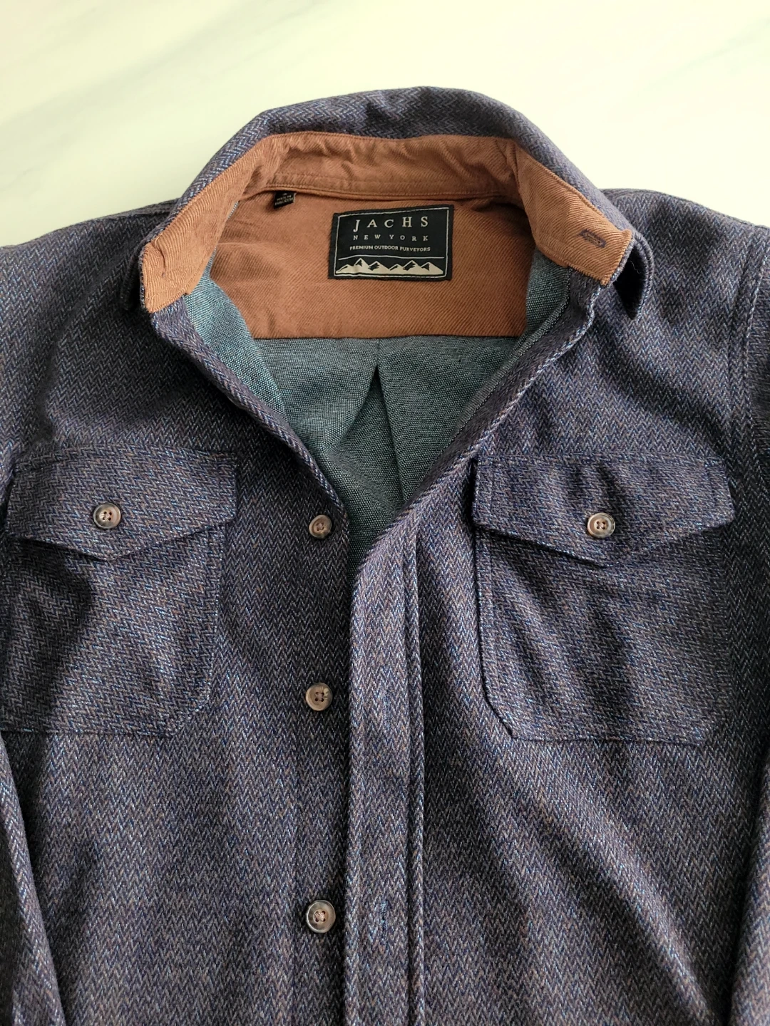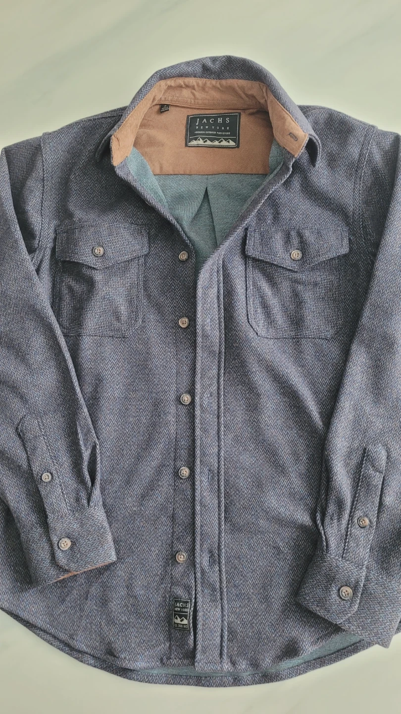This Jachs NY shirt jacket features a classic herringbone pattern. It has a cozy corduroy collar and two chest pockets. Perfect for layering on cooler days!