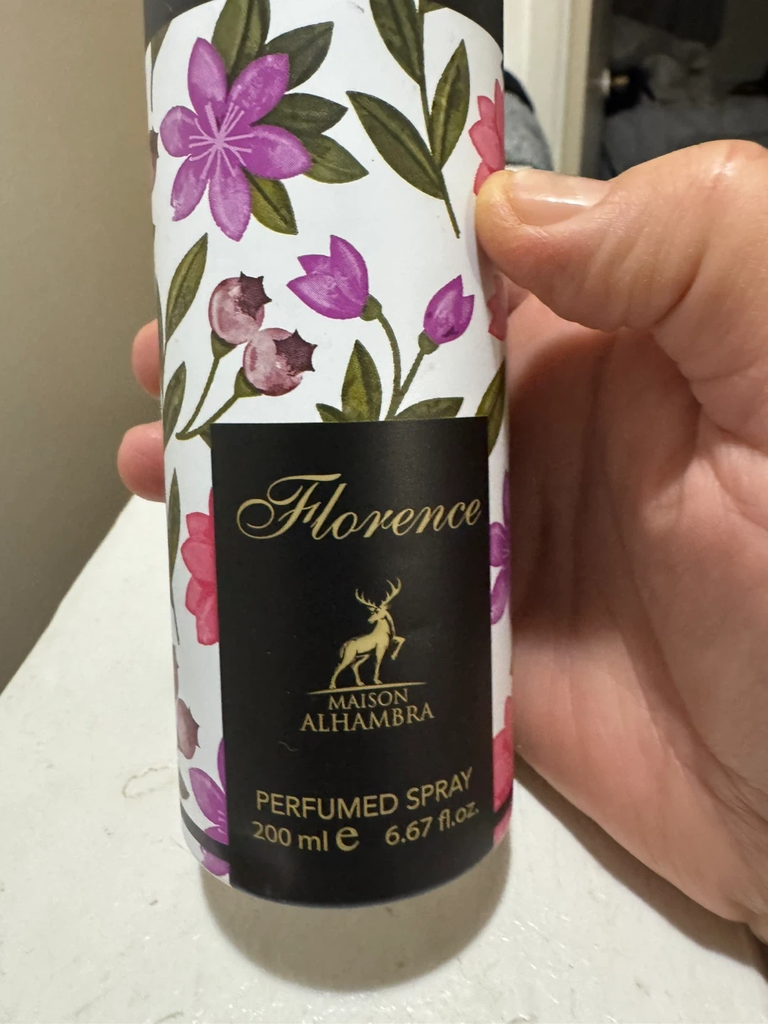 Selling a Maison Alhambra Florence perfumed spray. It contains 200 ml or 6.67 fl oz of product. It has a floral design on the bottle.