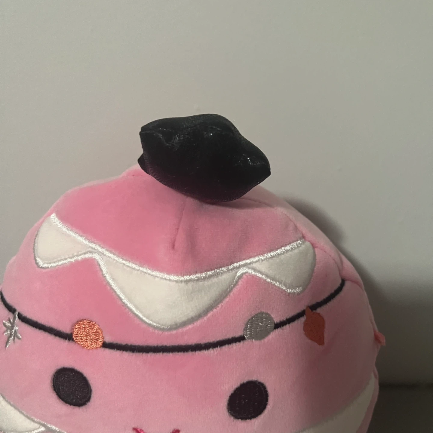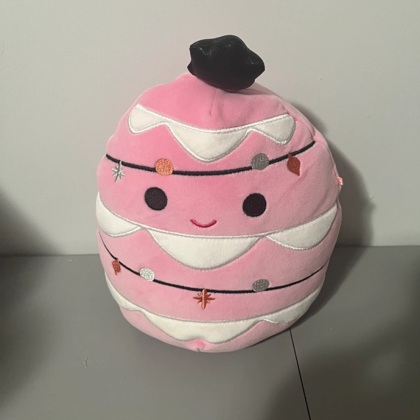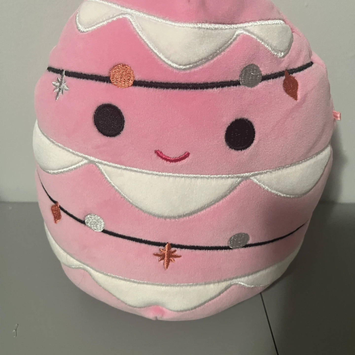 Soft, plush pink ornament-shaped Squishmallow. Features a cute embroidered face and string lights design. It's made of polyester material.