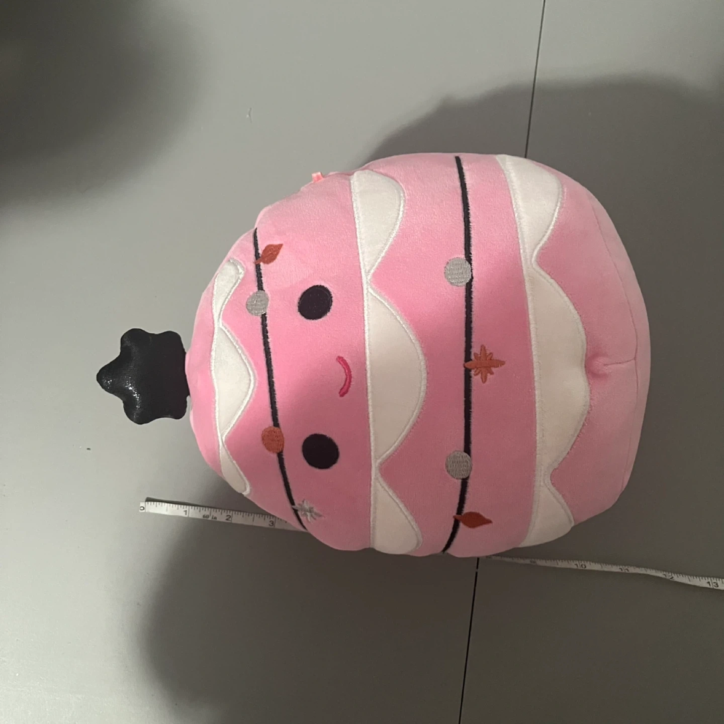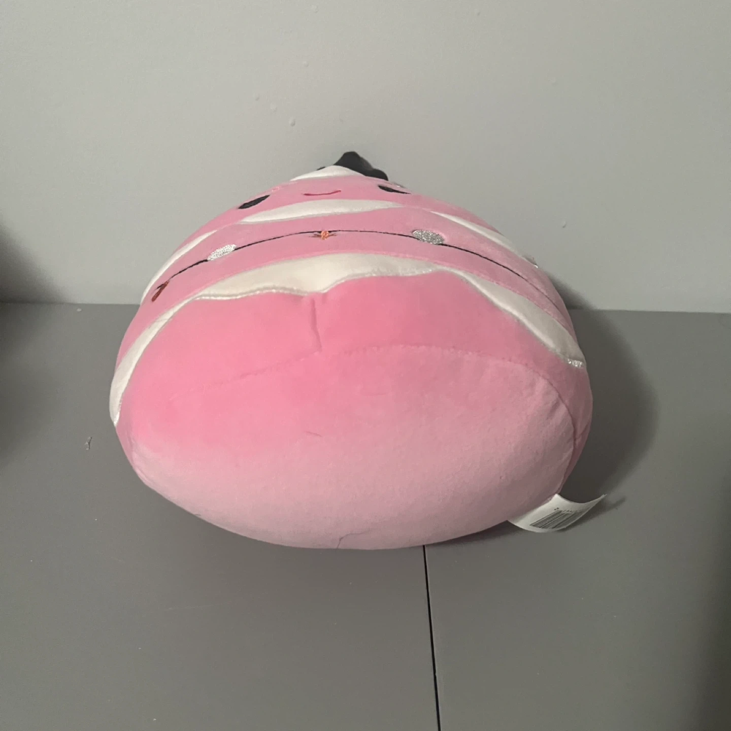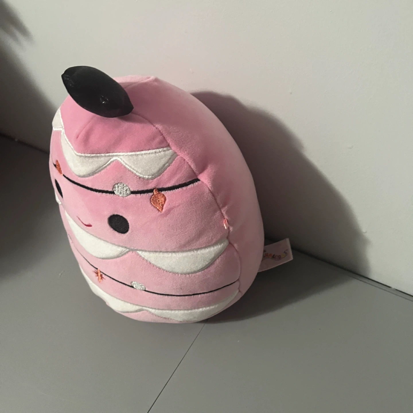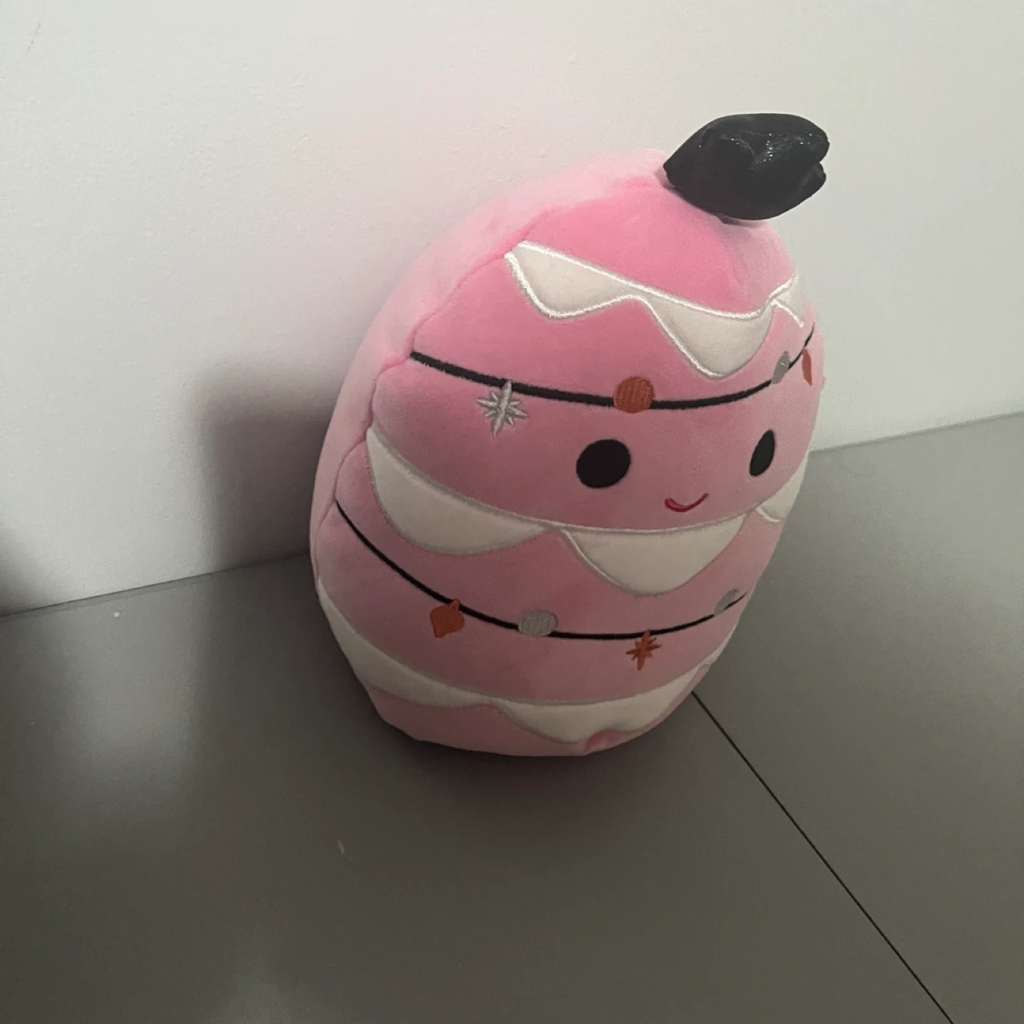 Soft, plush pink ornament-shaped Squishmallow. Features a cute embroidered face and string lights design. It's made of polyester material.