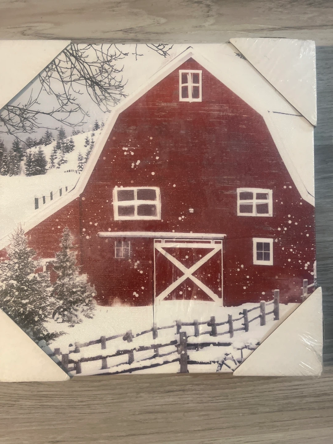 This canvas wall art depicts a charming red barn surrounded by a snowy winter scene. It's perfect for adding a rustic, festive touch to your home decor. The artwork is ready to hang, bringing a cozy atmosphere to any room.