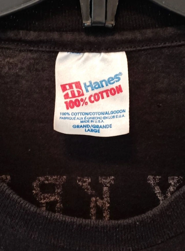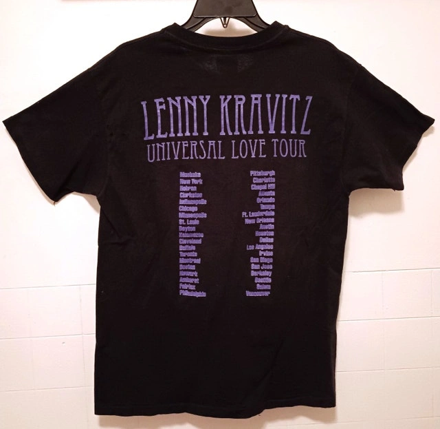 Authentic vintage Lenny Kravitz Universal Love Tour 1993 T-Shirt with North American locations on back. All pictures are of the actual shirt for sale, please see pictures for condition and measurements. Some wear on front print, black with minimal fading, a few small holes on back of left shoulder. Hanes 100% cotton. Available at safe, public meet-up in downtown Kitchener. Cash accepted.