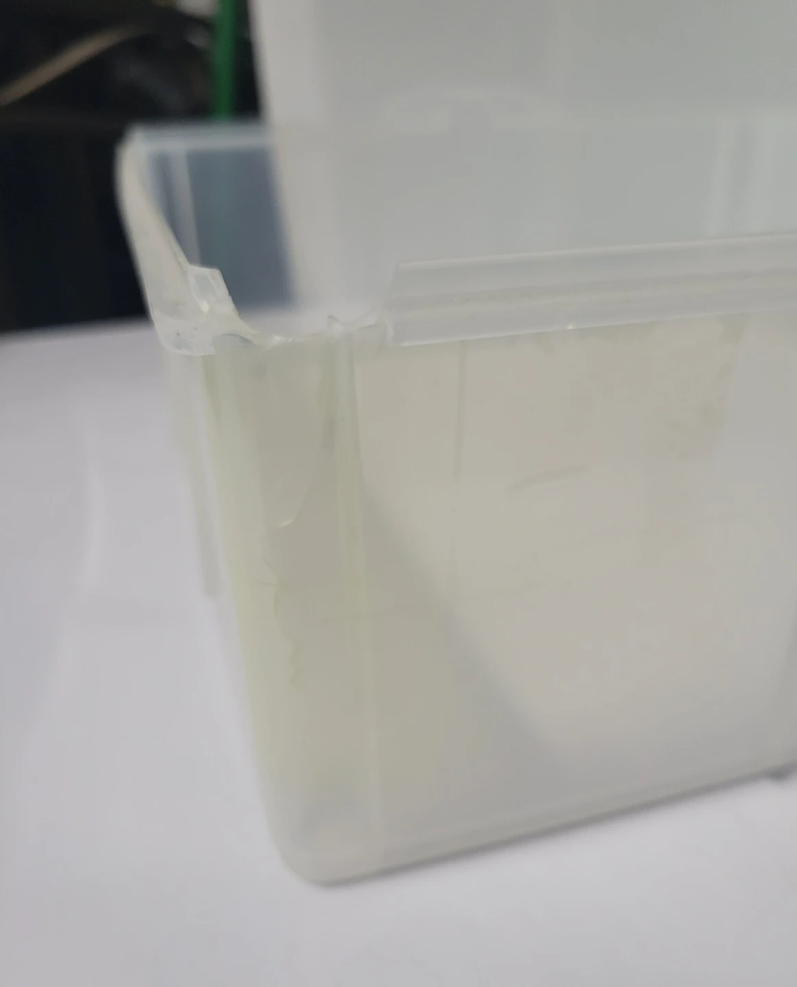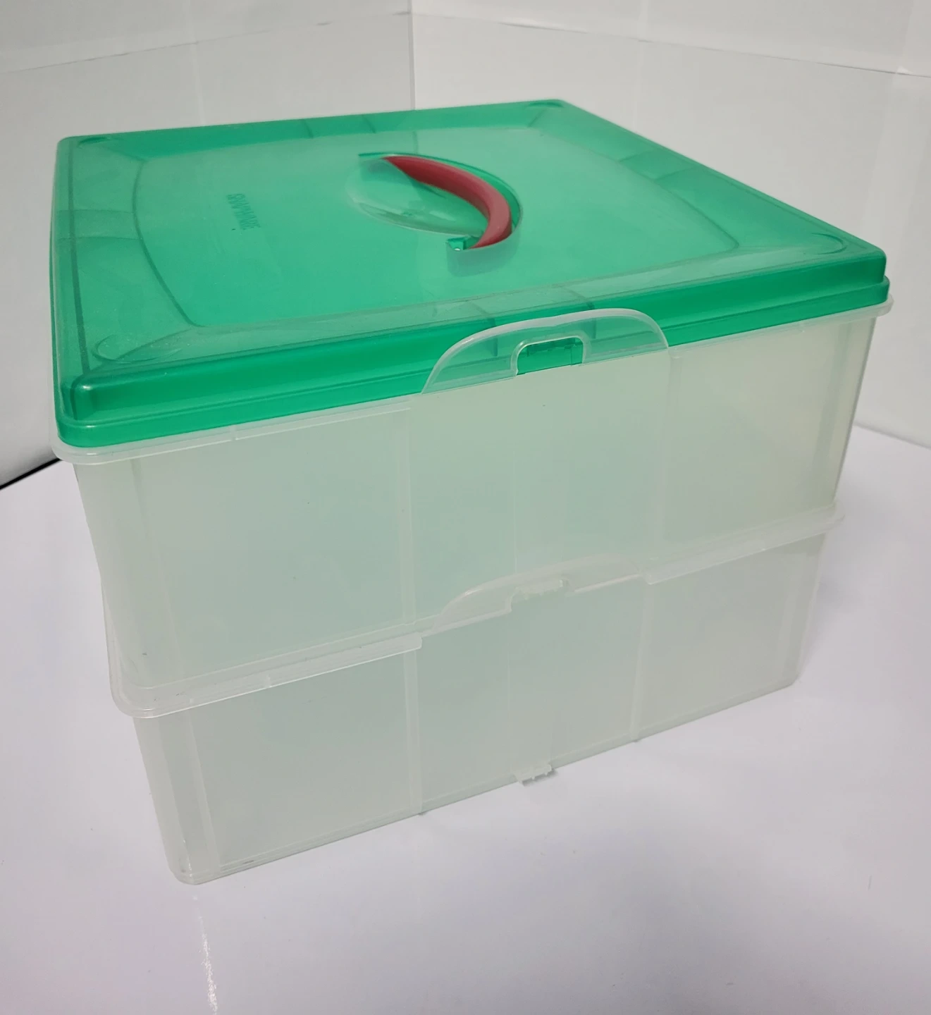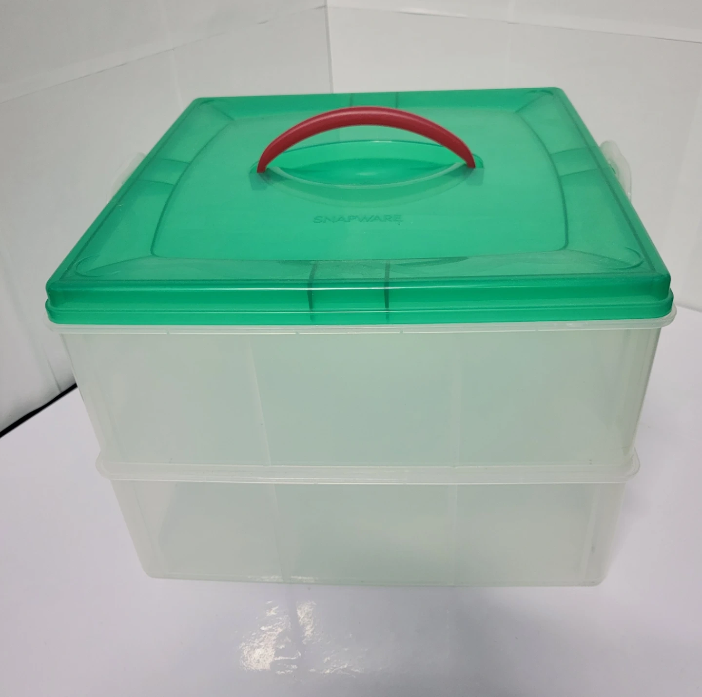 This is a Snapware plastic storage container. It features a clear body and a green lid with a red handle. It's great for organizing items. Minor crack (see photo)