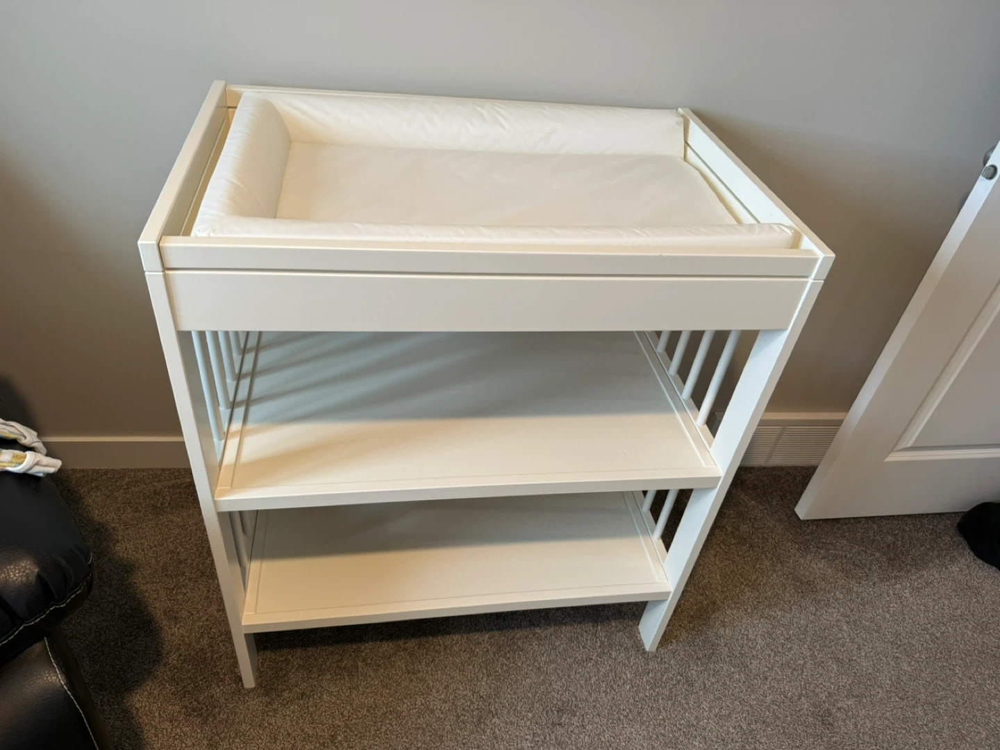 White IKEA Changeling changing table. It has two open shelves for storage. Includes changing mat. Minor scuff marks visible on the side.
