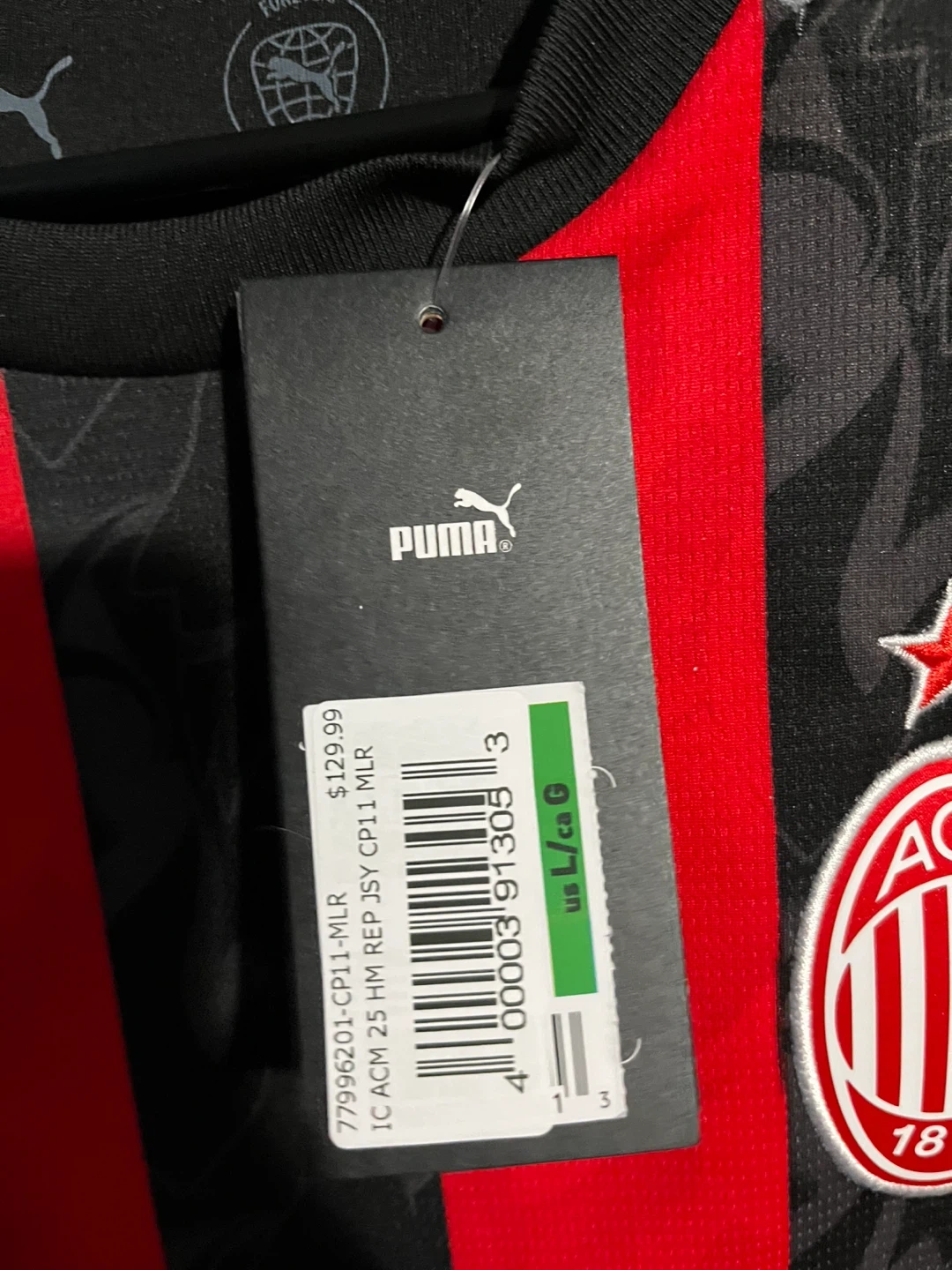 Get ready to cheer for AC Milan with this official Christian Pulisic #11 jersey! It's a size large and features the classic red and black stripes. Made by Puma, this shirt is perfect for any soccer fan.