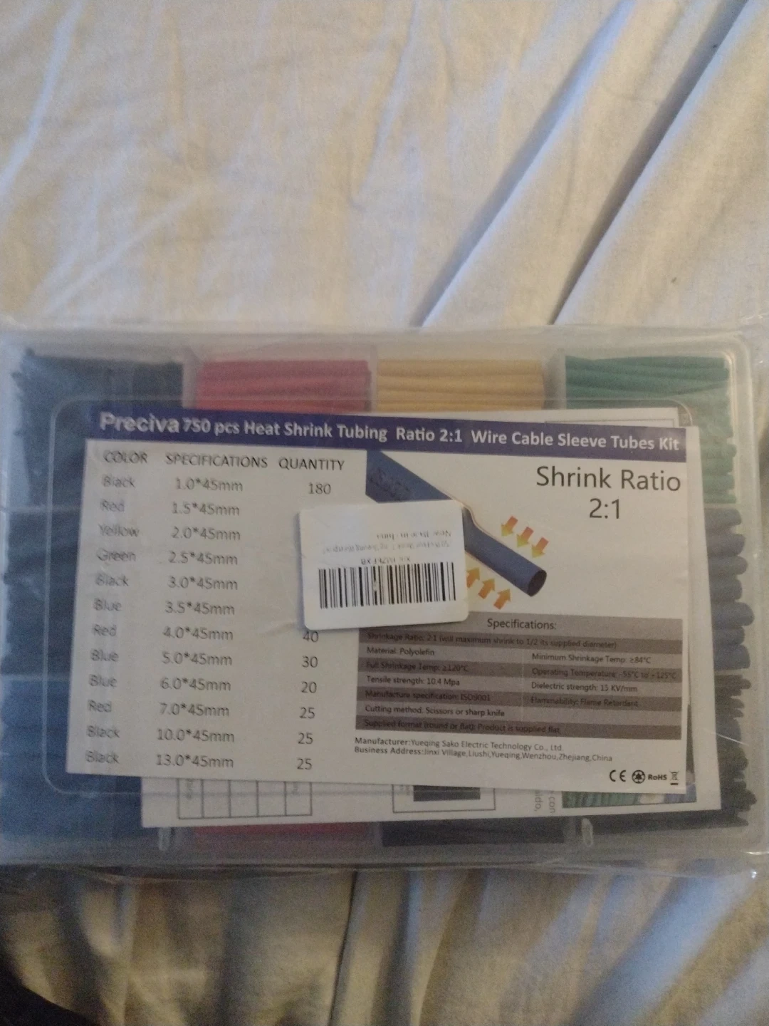 This is a 750 piece kit of Preciva heat shrink tubing with a 2:1 shrink ratio. It includes various sizes ranging from 1.0*45mm to 13.0*45mm, in multiple colours. The tubing is made of polyolefin material and can withstand temperatures up to 120°C. This kit is useful for protecting wire and cable connections.