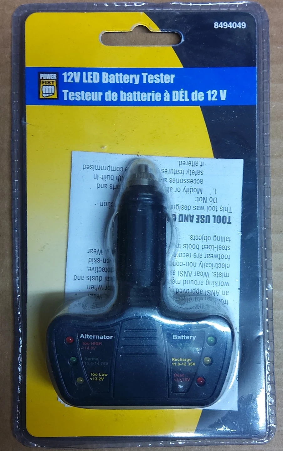 Checks your car's alternator and battery status. Shows status with LED lights for 'Too High', 'Normal', 'Too Low', 'Recharge', and 'Dead'. Easy to use plug-in design.