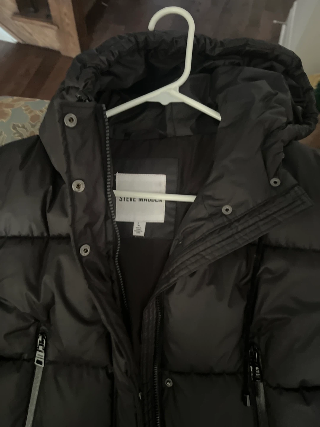 Selling a Steve Madden puffer coat in black! It's a size large and in great condition. Perfect for staying warm during the colder months!