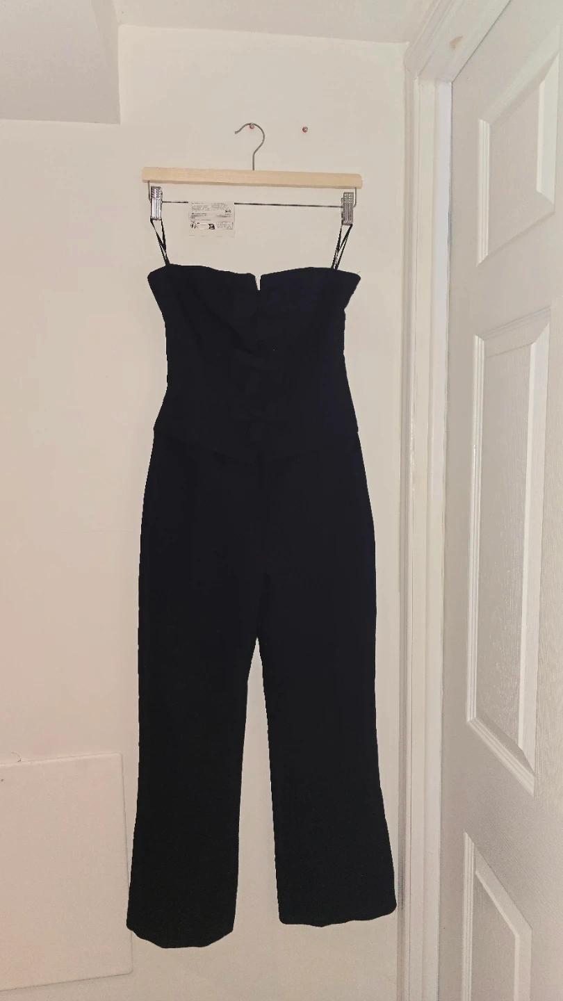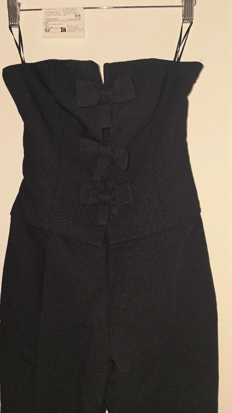 This black strapless jumpsuit features a flattering silhouette with a unique bow detail at the bust. It's crafted from a textured fabric. This stylish piece is perfect for an evening out or a special occasion!