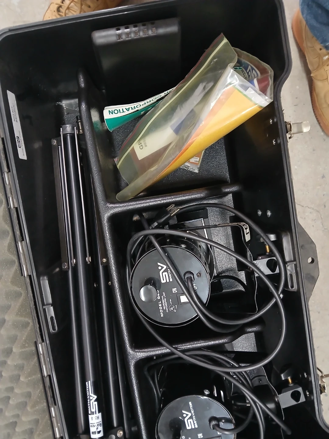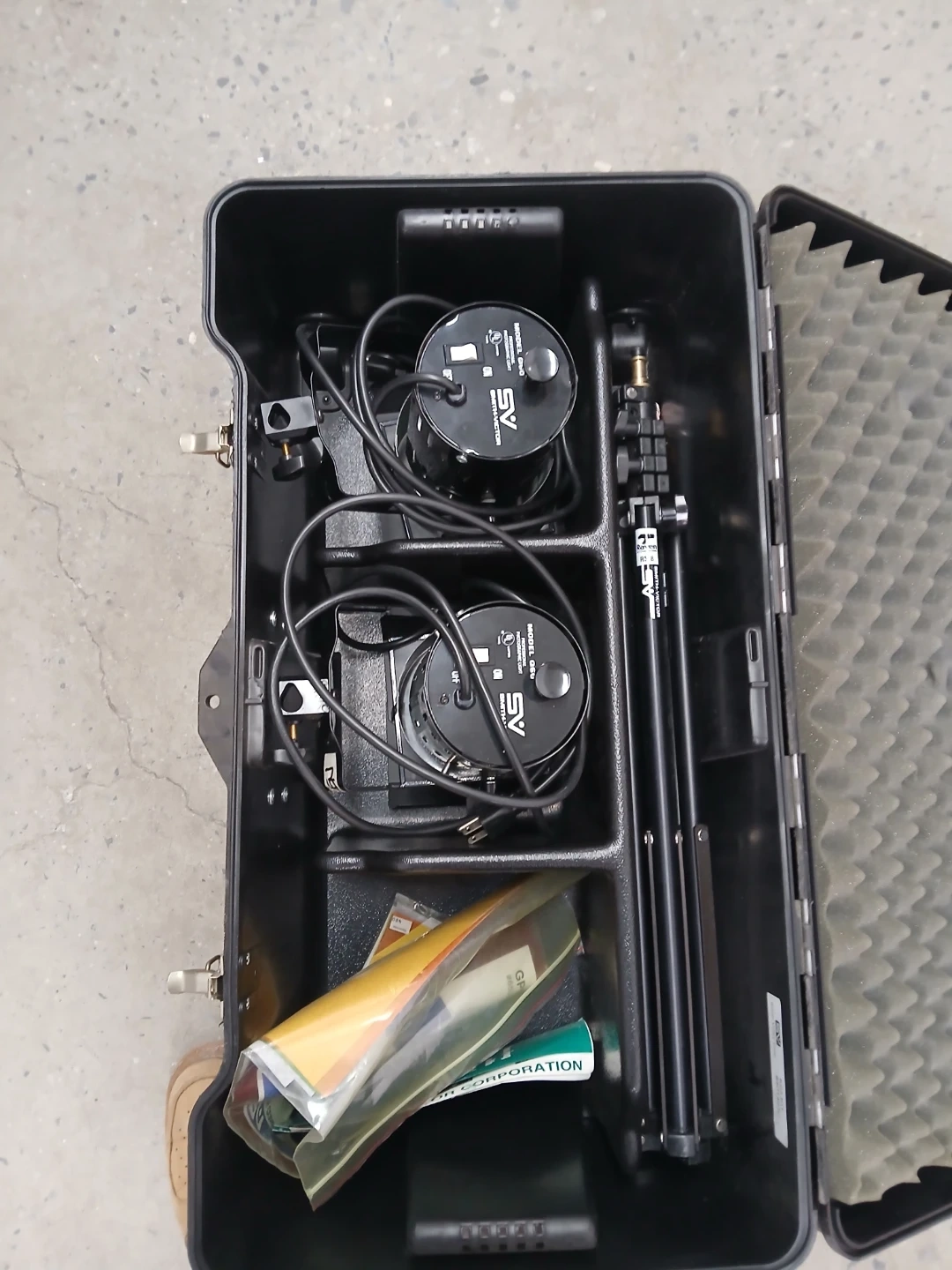 This is a Smith-Victor K63 Kit with two professional photographic lights. Each light is a Model Q60, 600W, with a 2-pin prefocus base. Kit includes stands and case. It's designed for photographic use.