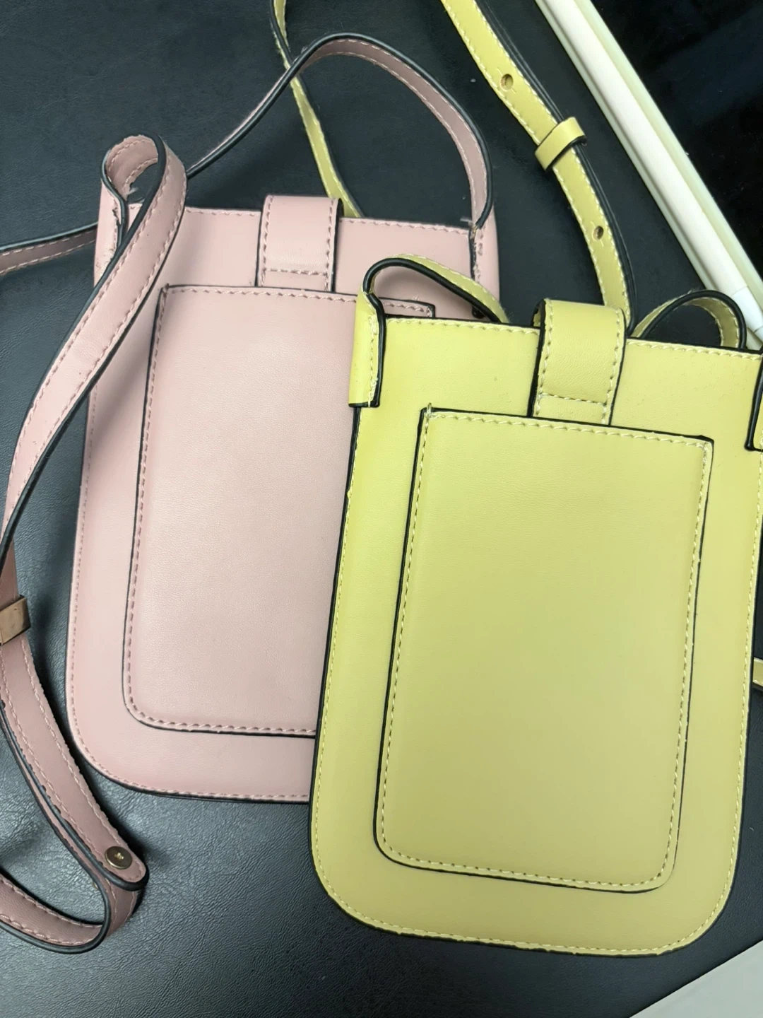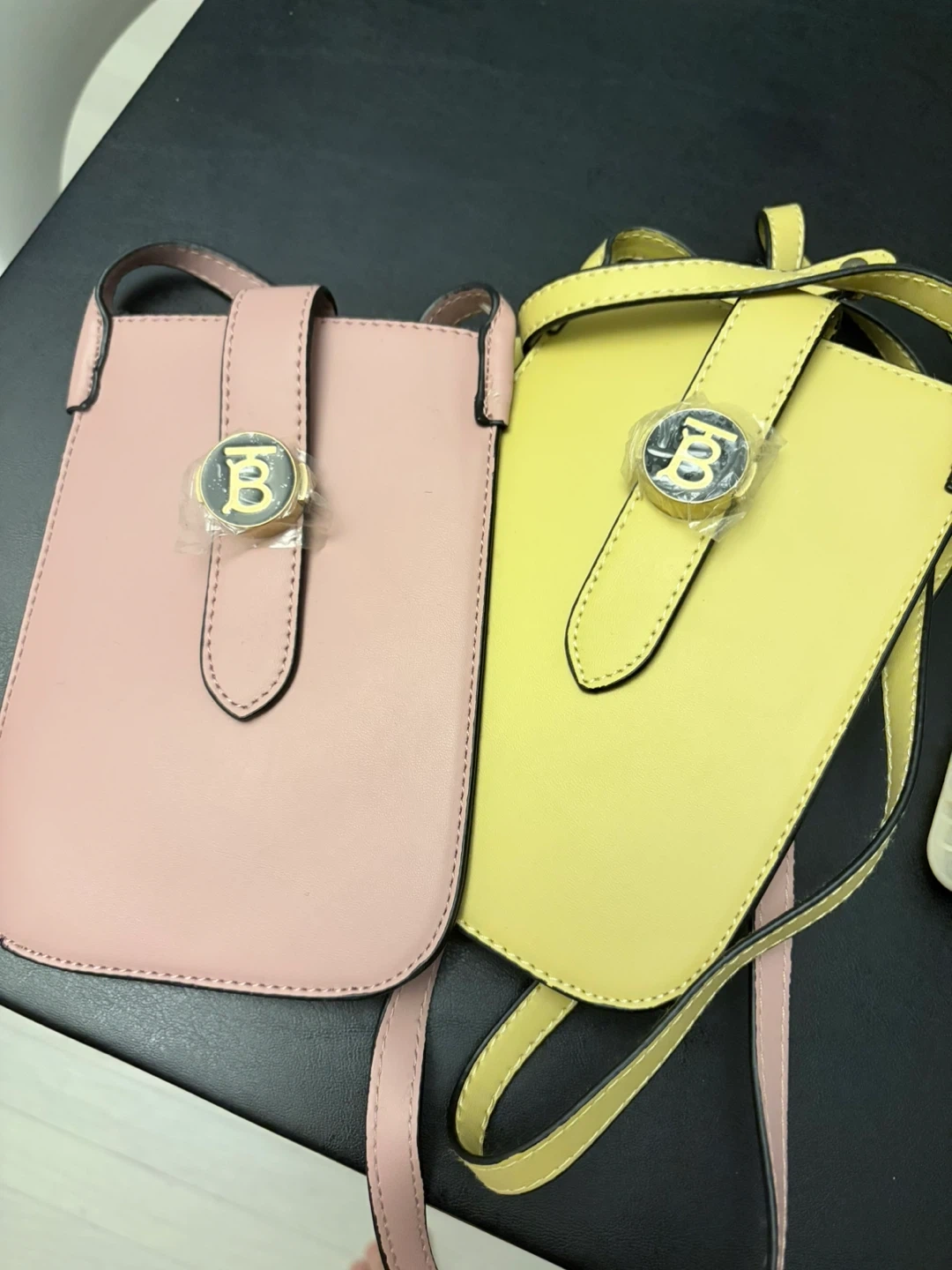 Two cute phone crossbody bags, one in soft pink and one in a cheerful yellow. They're perfect for keeping your phone and small essentials secure and accessible. Each bag has a faux leather exterior with a secure closure.