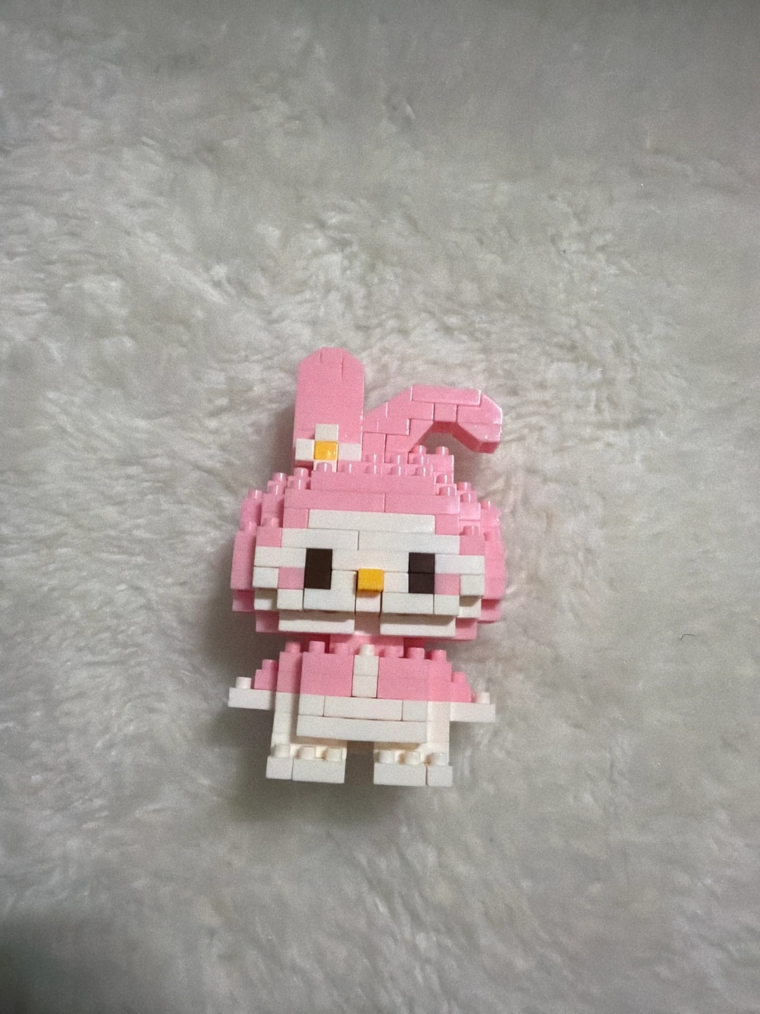 This is a pink My Melody figurine made from building blocks. It's a cute and colorful addition for any Sanrio fan. Great for display!