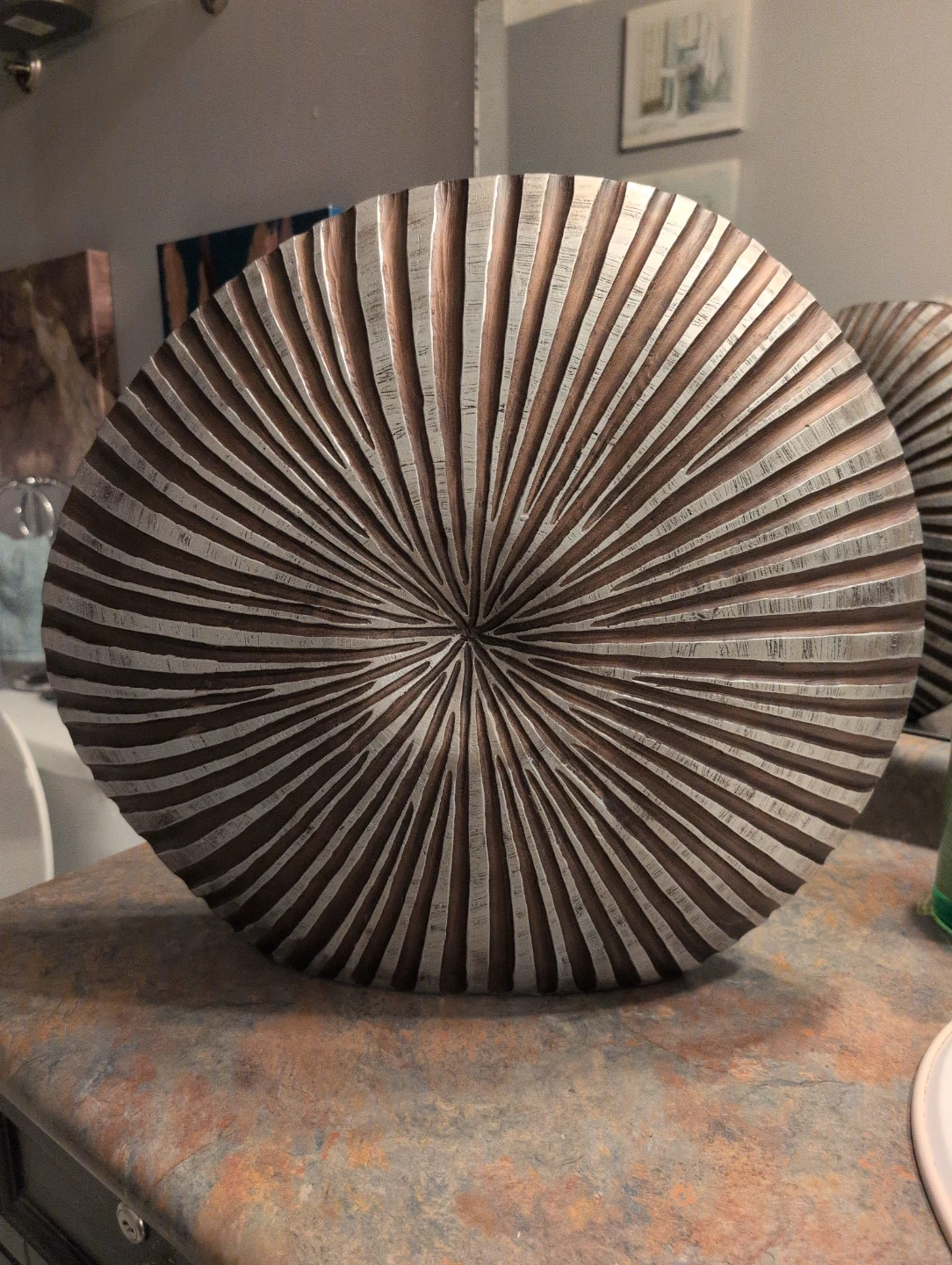 This is a decorative vase with a unique sunburst carved design. It has a metallic finish that looks like brushed nickel and wood. It's a great piece for adding texture to a room. The vase is a substantial size.
