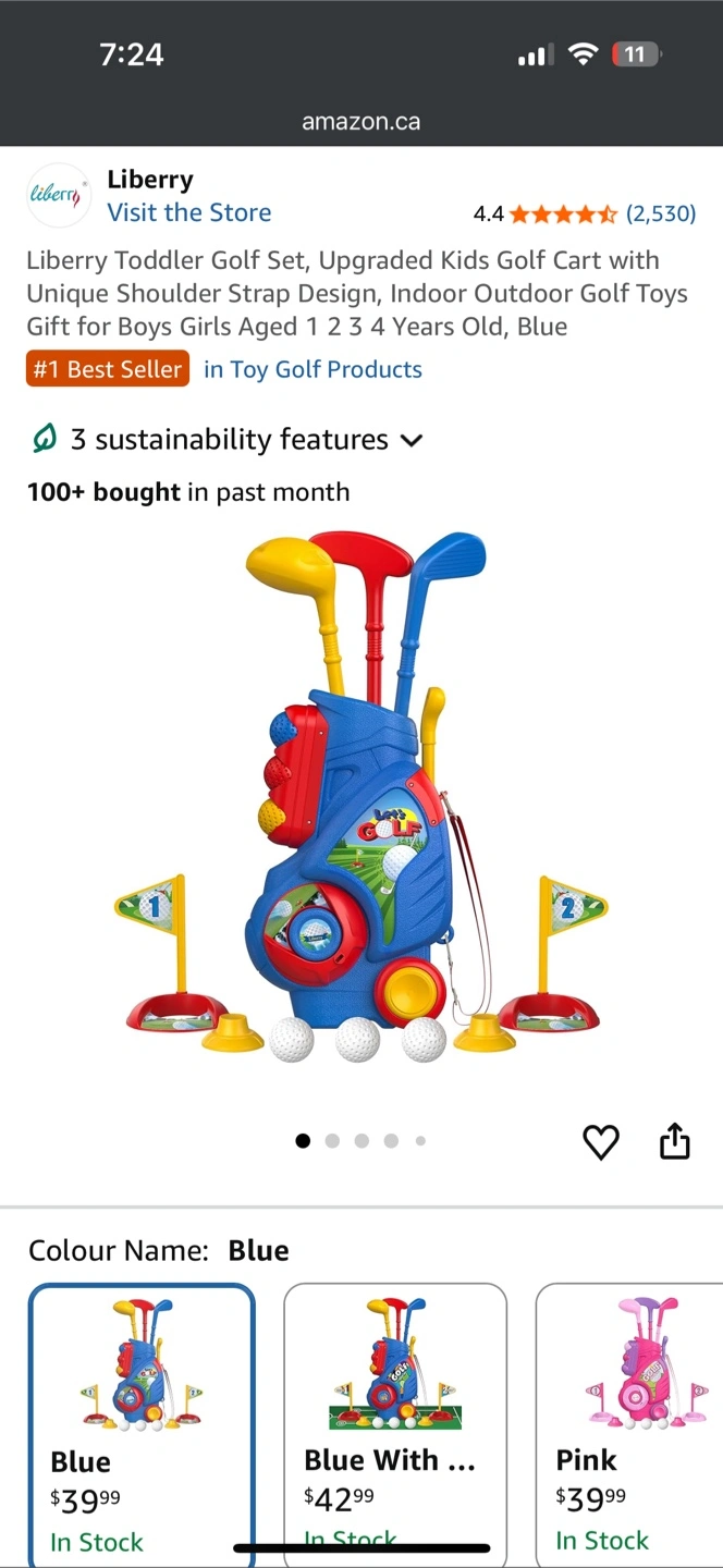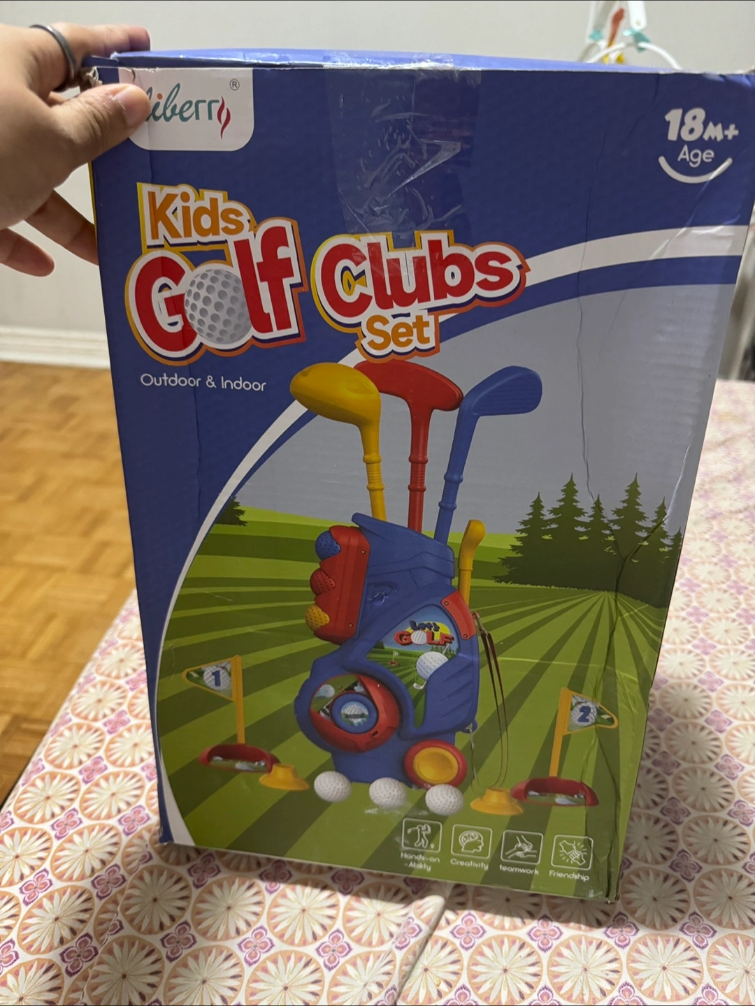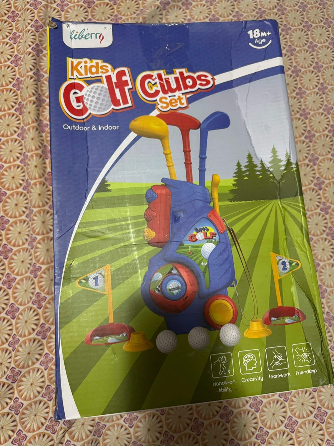 This is a Liberry kids golf clubs set for outdoor and indoor play. It includes 3 clubs, 1 bucket, 3 colored balls, 3 white balls, 2 golf tees, and 2 holes. It's recommended for ages 18 months and up. This toy encourages hands-on ability, creativity, teamwork, and friendship. It's a fun starter set for young golfers!