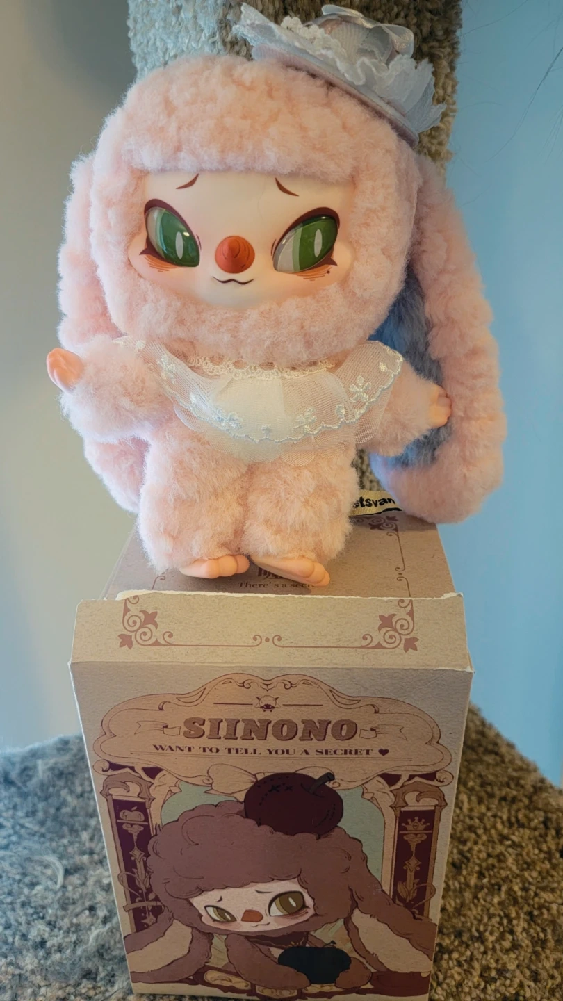 SIINONO plush doll toy collectible keychain charm. Features a soft, fuzzy pink exterior and large green eyes. Includes original packaging & removable outfit accessories