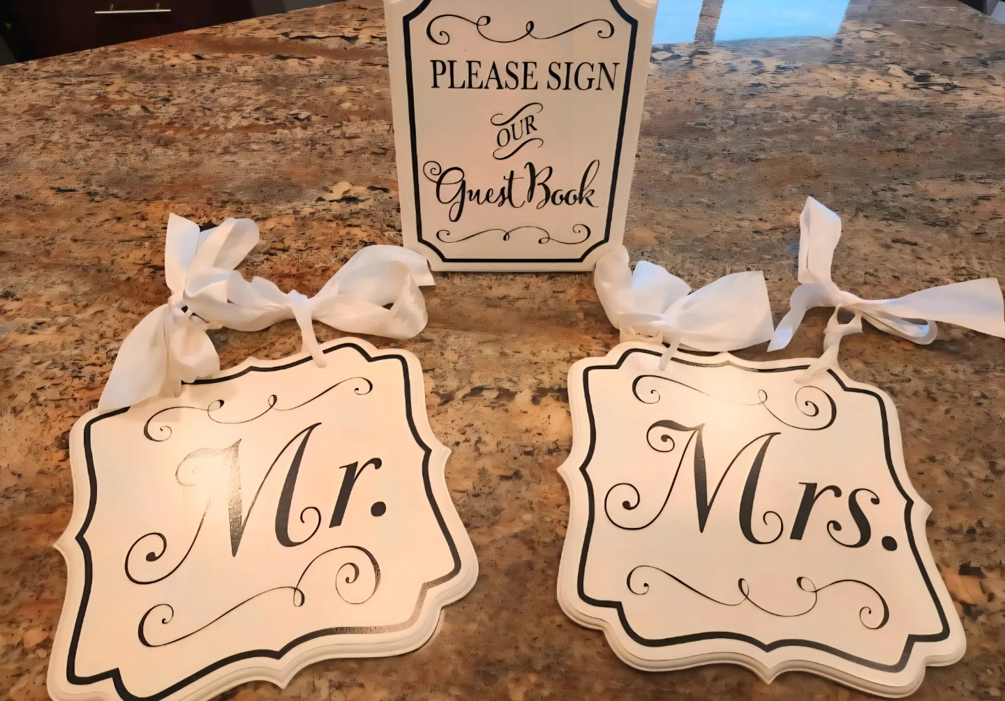 A set of decorative wooden signs for your wedding day! Includes a "Mr." sign and a "Mrs." sign, each with white ribbon ties. Also comes with a "Please Sign Our Guest Book" sign. Perfect for directing guests and adding a personal touch to your reception.