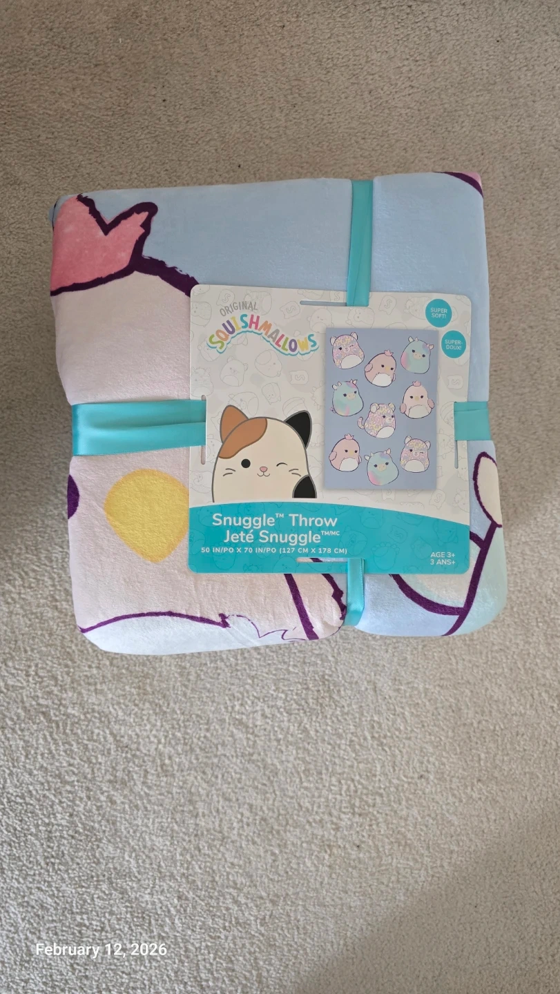 This is an original Squishmallows Snuggle Throw, featuring Jeté Snuggle. It's super soft and measures 50 inches by 70 inches (127 cm x 178 cm). This throw is suitable for ages 3 and up.