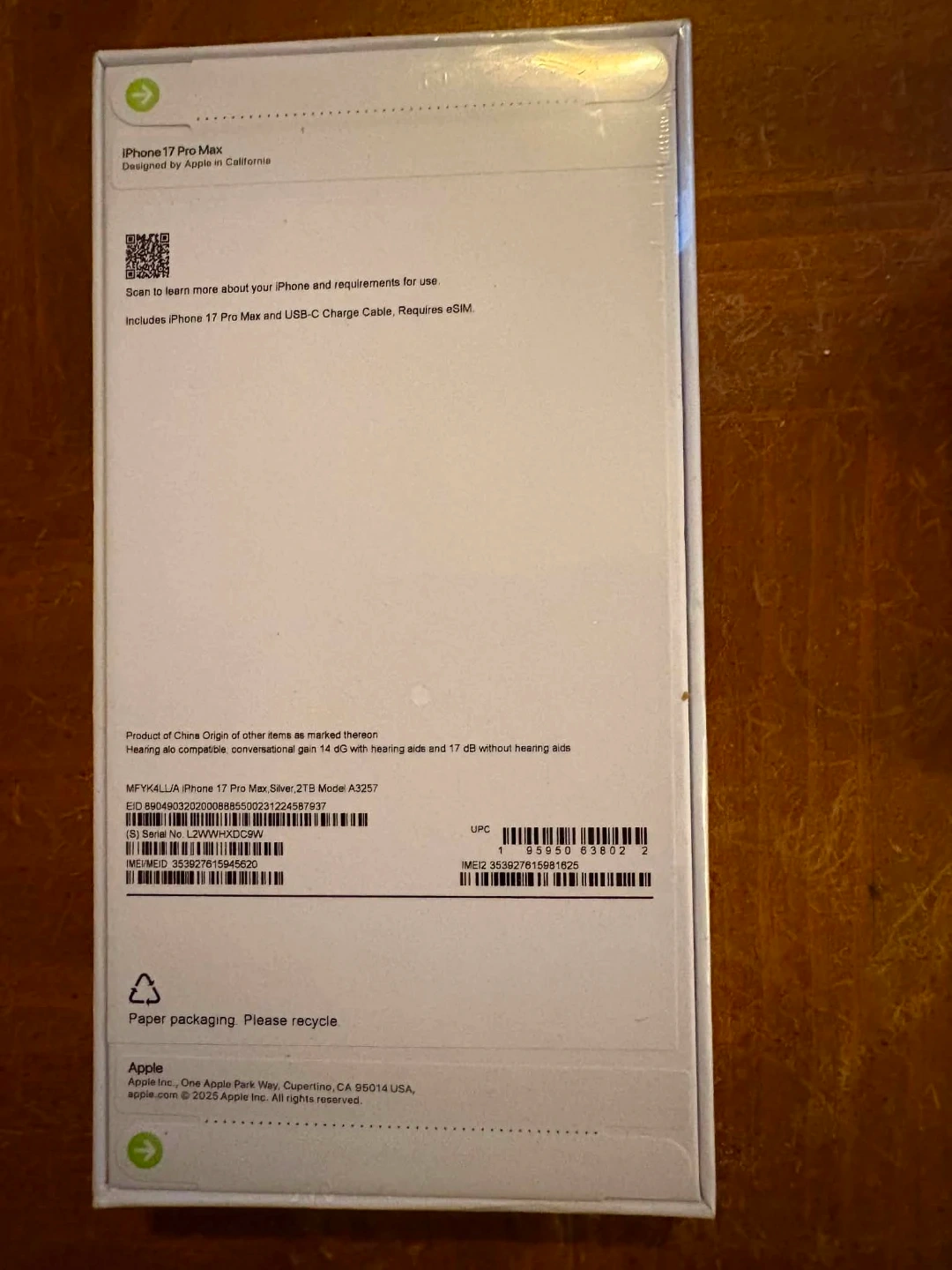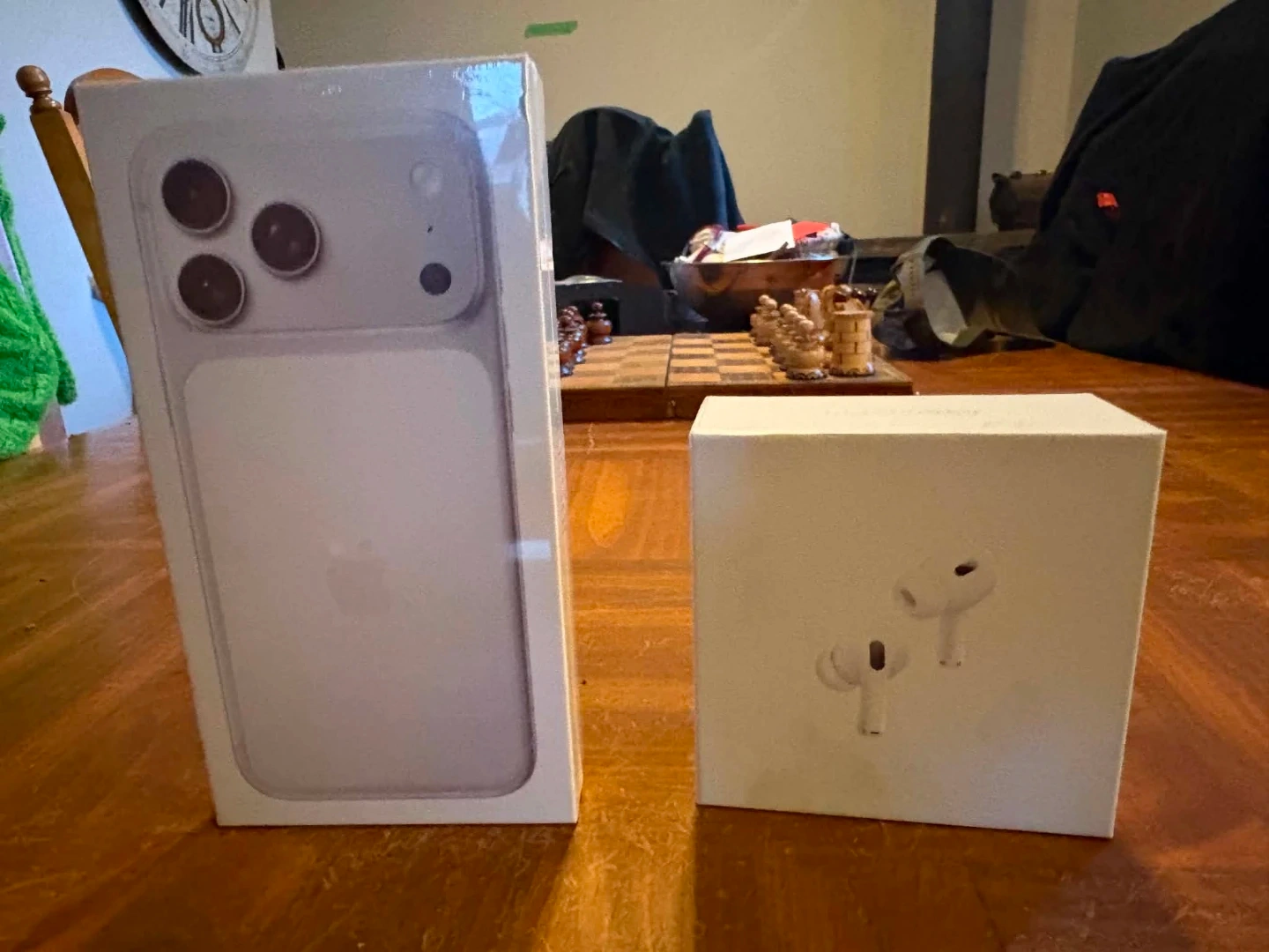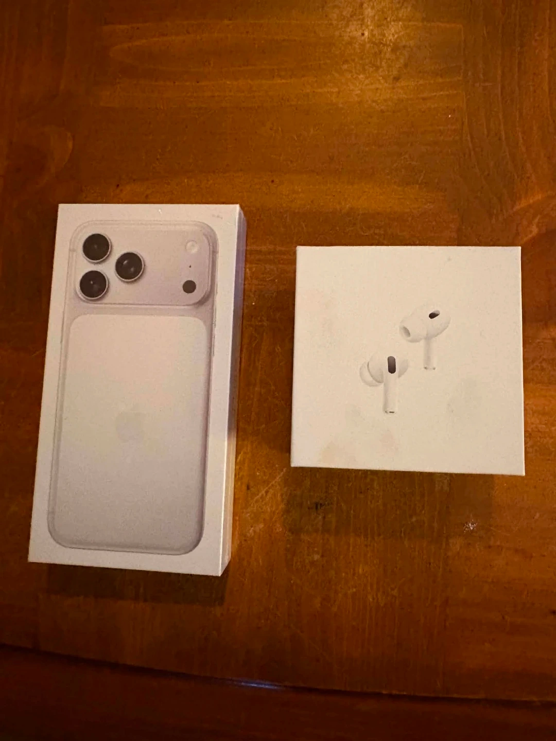 Unopened Apple iPhone 17 Pro Max in Silver, 2TB storage. Includes USB-C Charge Cable. Also includes sealed AirPods Pro (2nd generation) with MagSafe Charging Case (USB-C). Both items are brand new and sealed in their original packaging.
