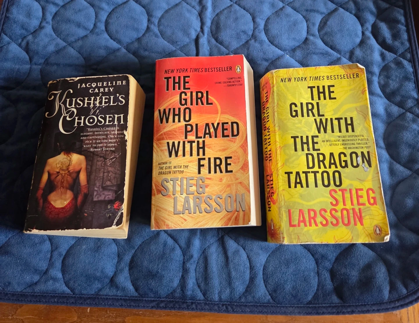 #🤎FREE Three novels are included: Kushiel's Chosen by Jacqueline Carey, and The Girl with the Dragon Tattoo and The Girl Who Played with Fire by Stieg Larsson. These are paperback editions. They're great reads for thriller and fantasy fans.