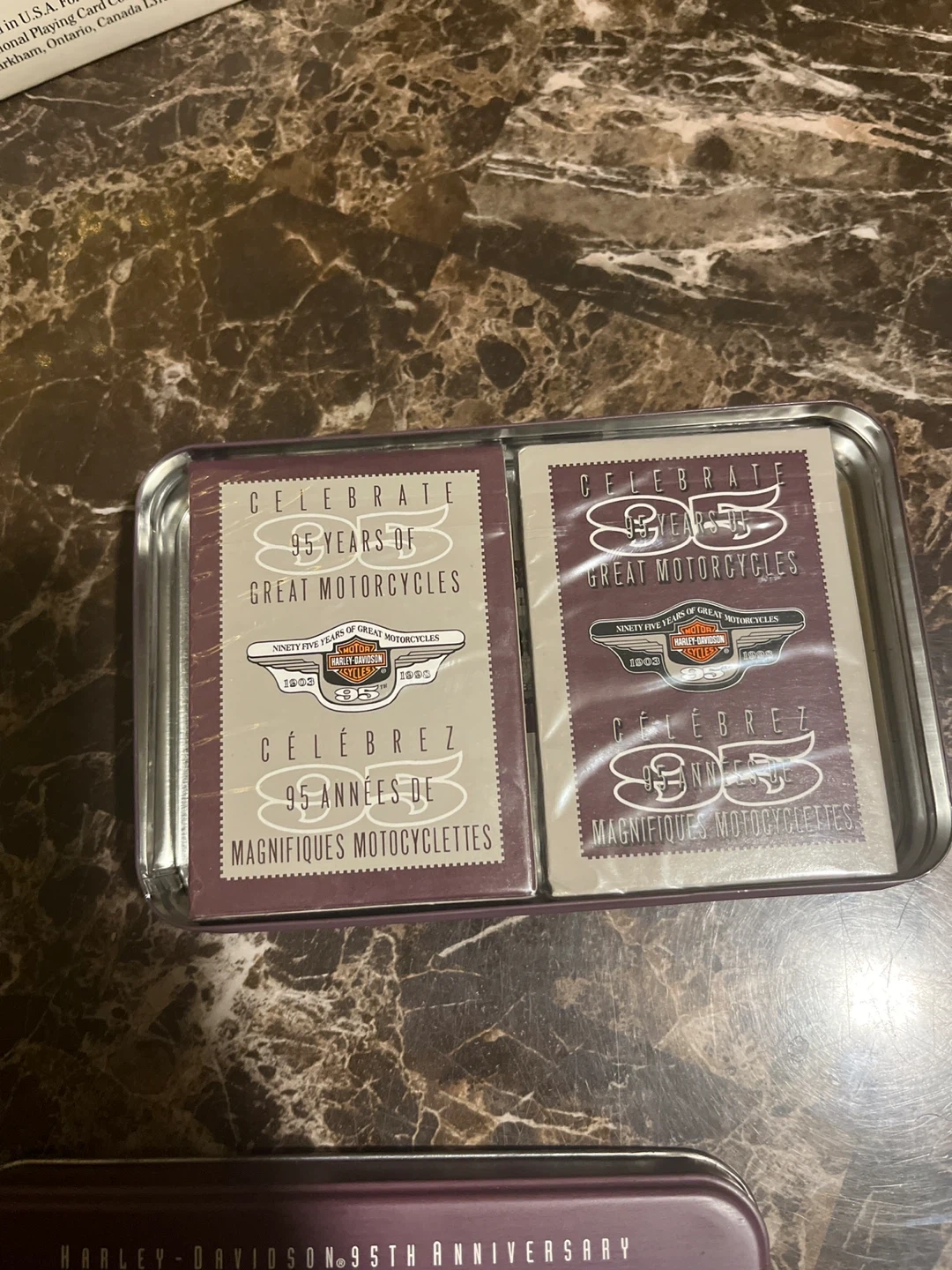 This tin features two decks of playing cards celebrating Harley-Davidson's 95th Anniversary. It's a nice collectible for motorcycle enthusiasts. Includes original tin packaging.
