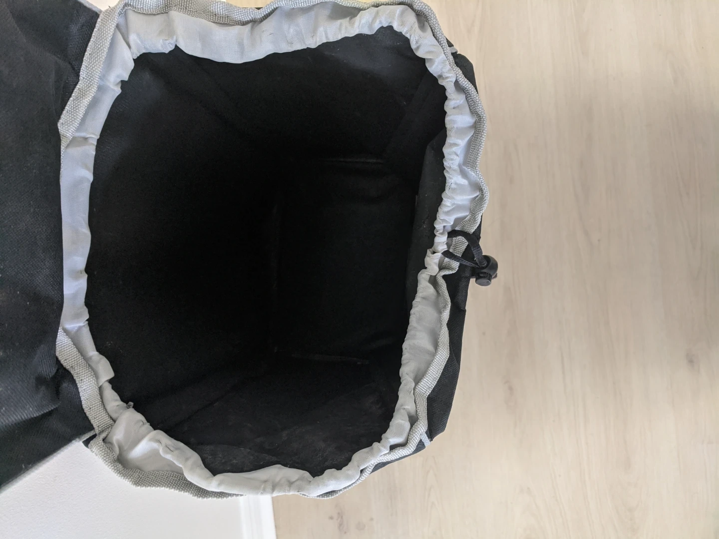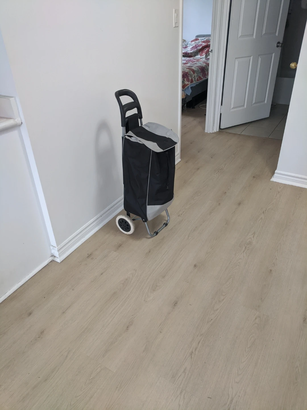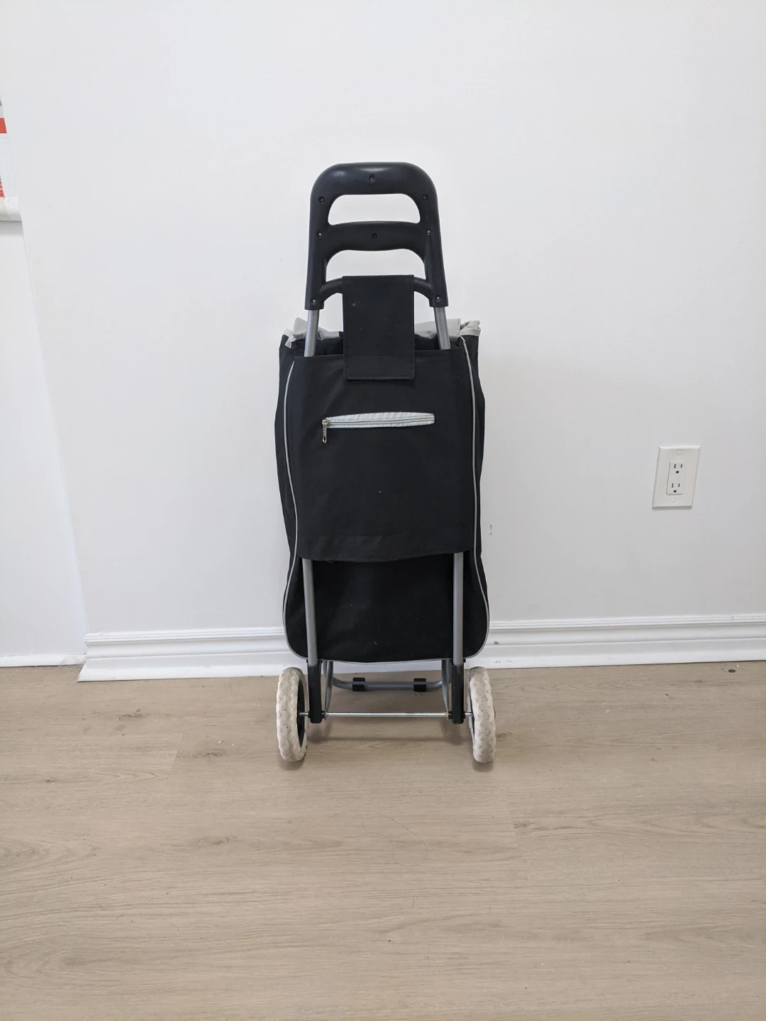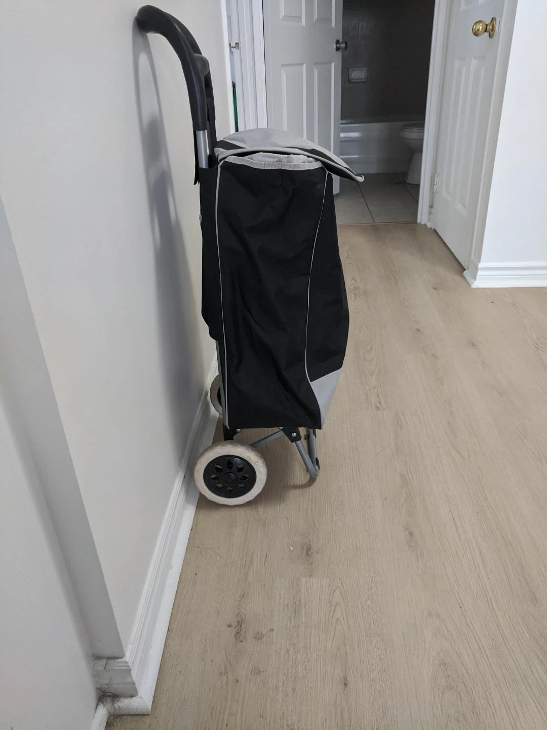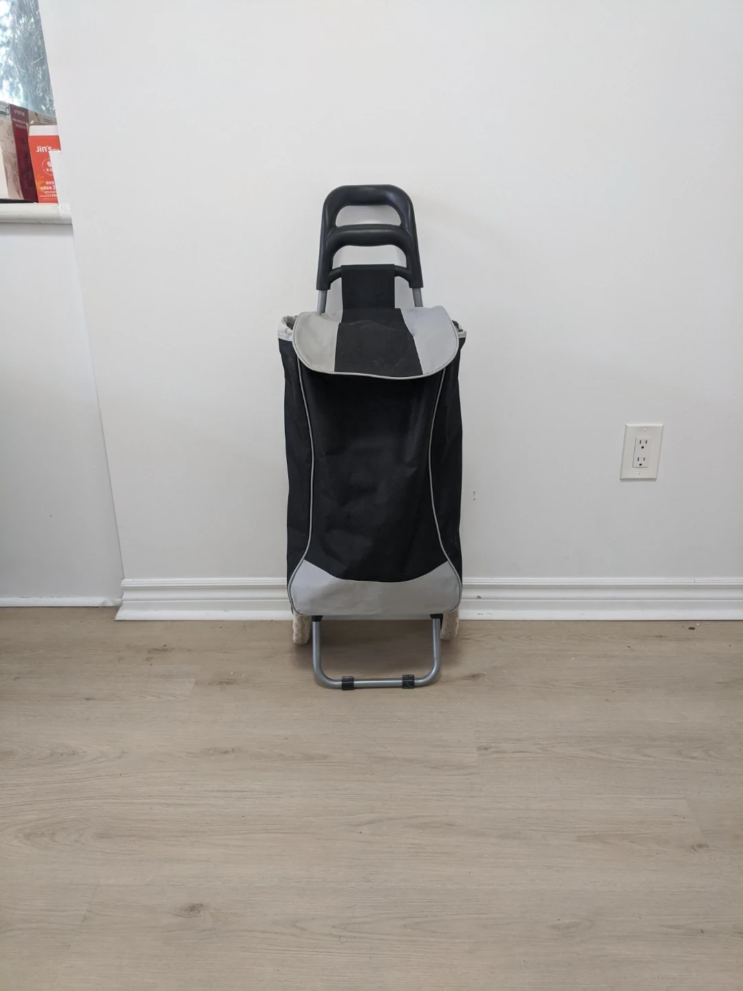 A black and grey shopping trolley bag. It's made of durable fabric and features a sturdy frame with wheels. This bag's great for carrying groceries or laundry!