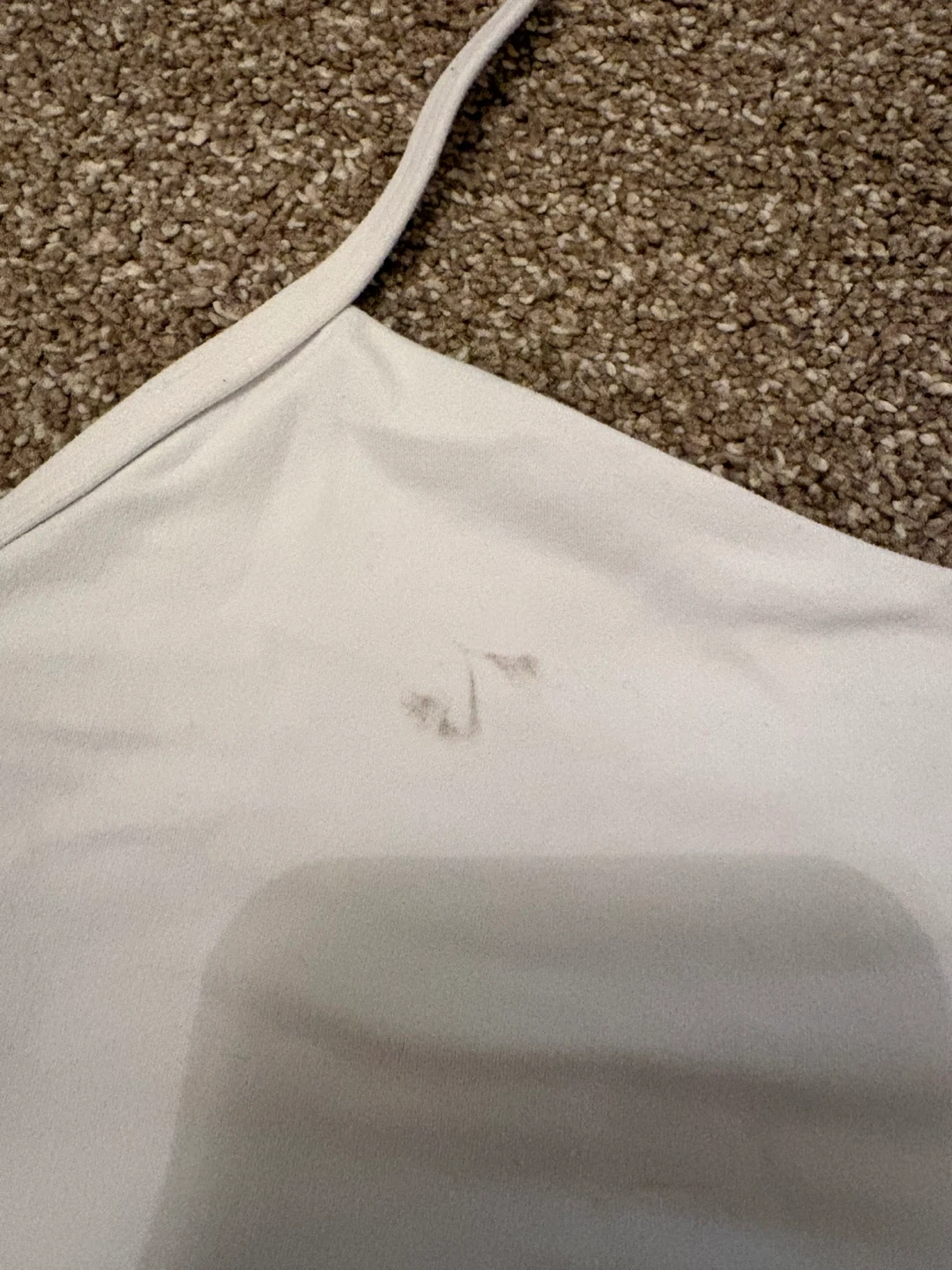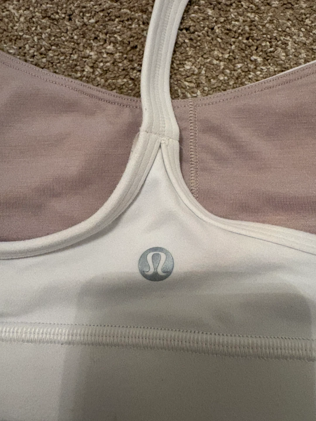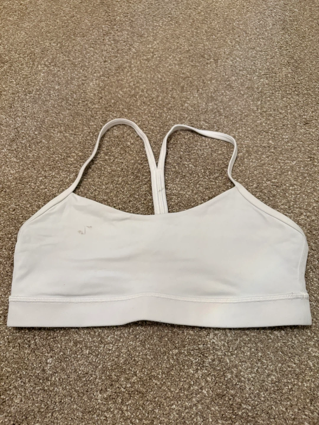 This Lululemon Align sports bra is white and size 8. It is in very good condition, with removable padding, with a small stain on the front.