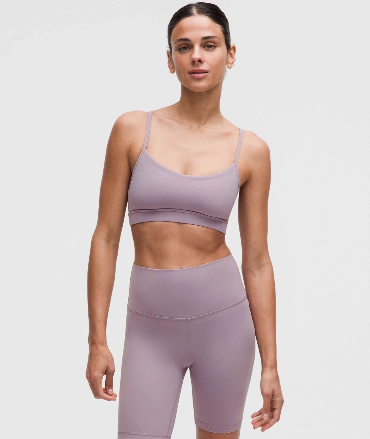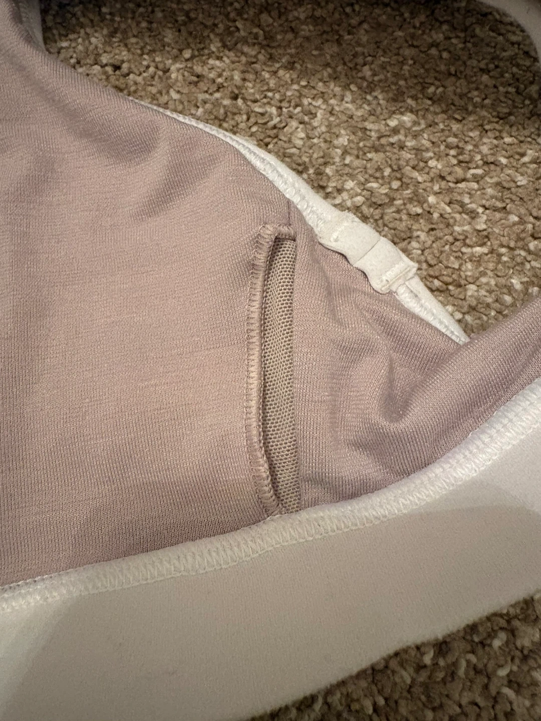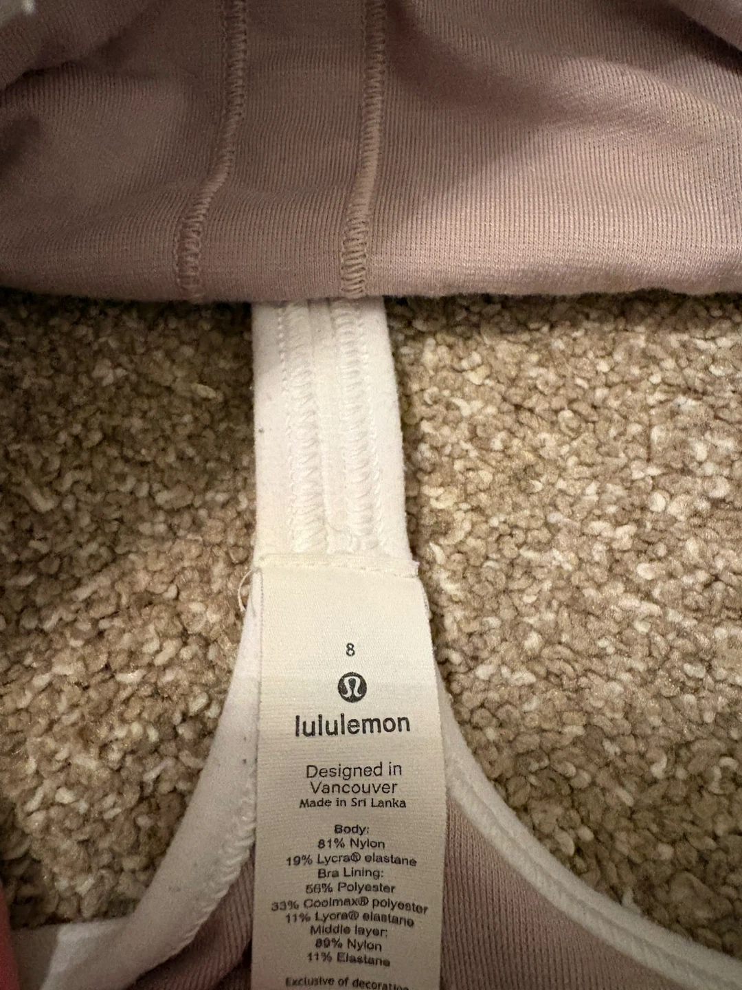 This Lululemon Align sports bra is white and size 8. It is in very good condition, with removable padding, with a small stain on the front.
