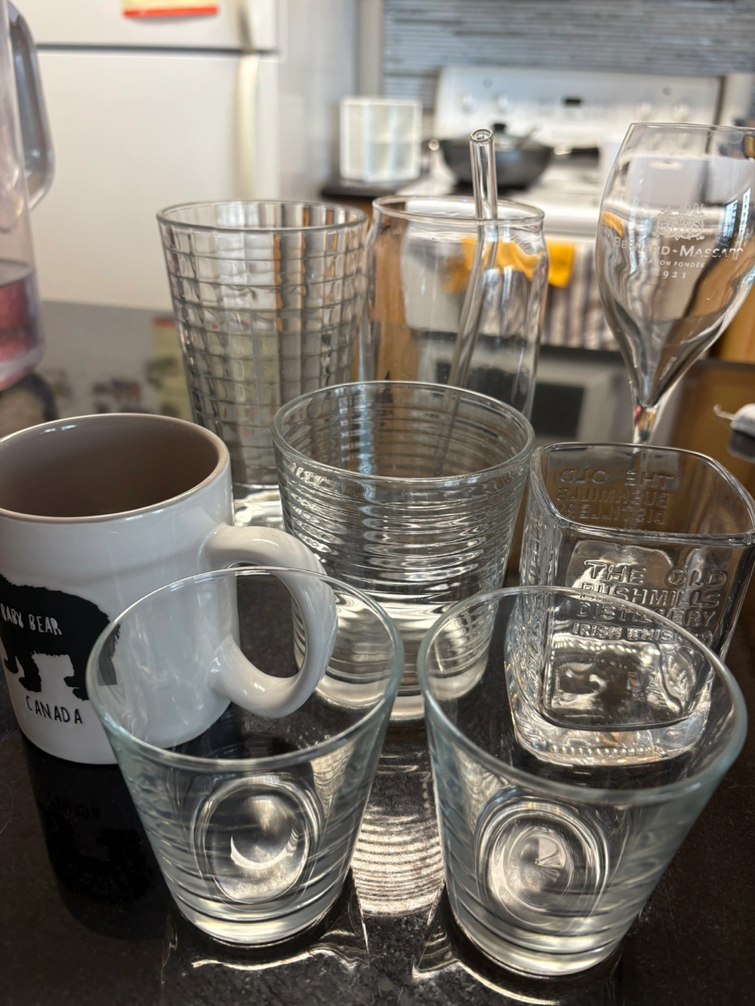 8 of Assorted glassware for sale. Includes several drinking glasses, a mug featuring a bear and Canada text, and a champagne flute. Excellent for entertaining or everyday use.