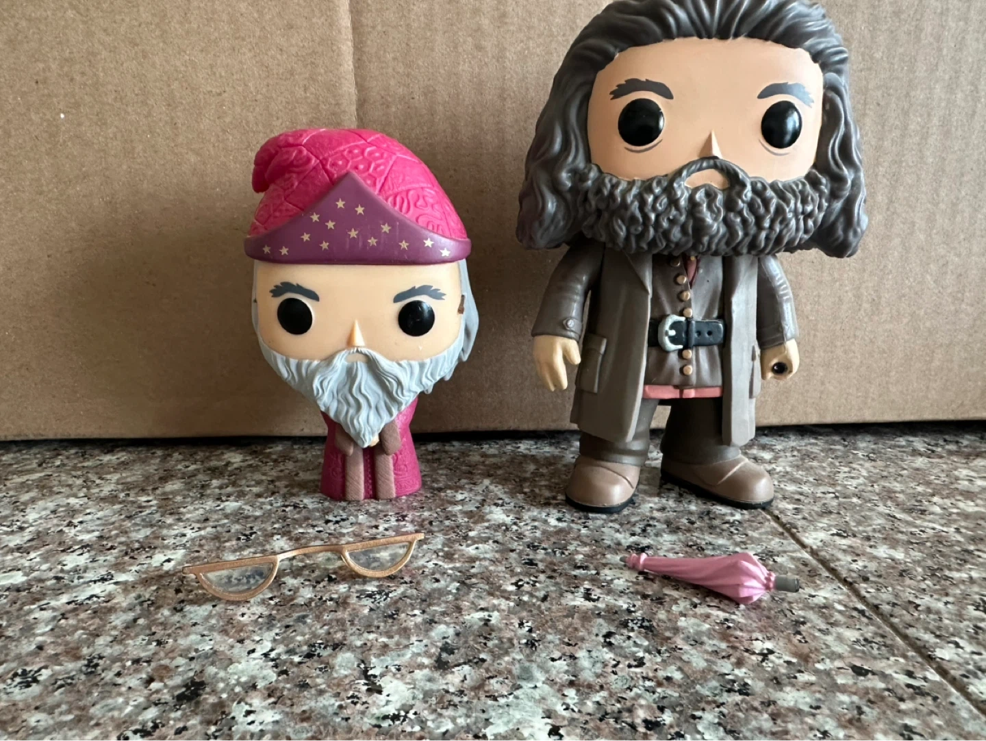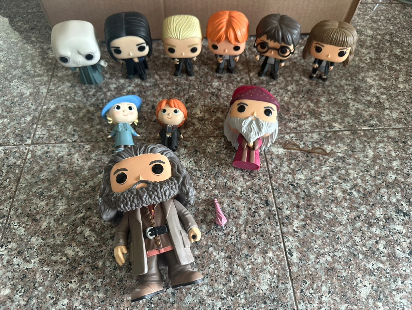 Collection of Funko Pop! vinyl figures from the Harry Potter series. Includes: Harry, Hermione, Ron, Draco, Snape, Dumbledore and Hagrid ( these two have broken glasses and an umbrella) plus two mini pop figures of Ron and Fleur