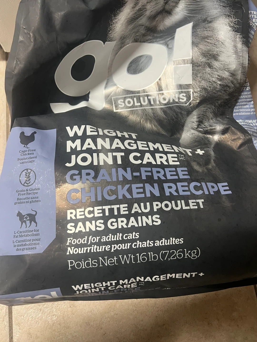 This is a bag of GO! SOLUTIONS Weight Management + Joint Care Grain-Free Chicken Recipe cat food. It's formulated for adult cats and is grain-free. L-Carnitine is included for fat metabolism. This food helps support urinary tract health and immune function.