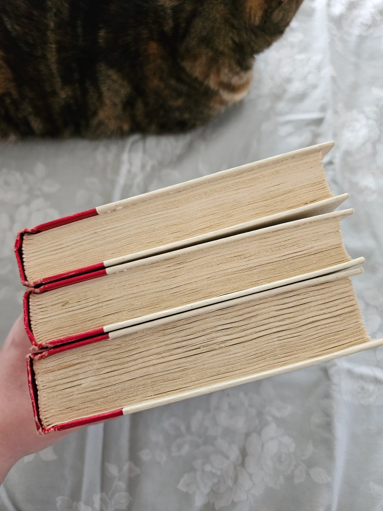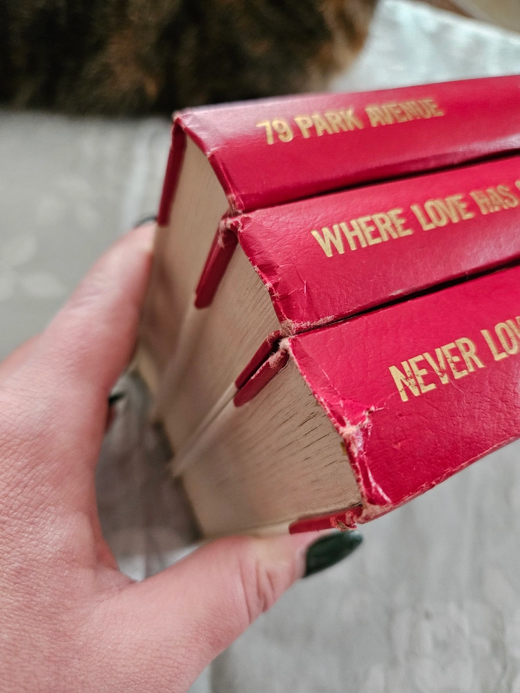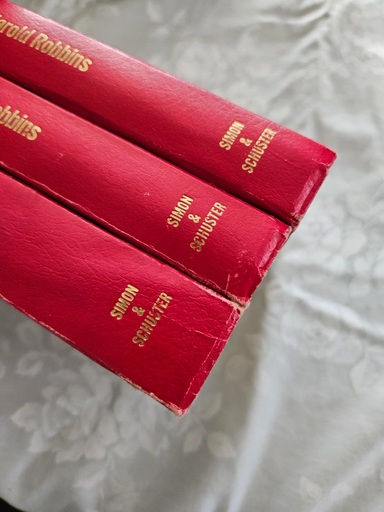 Collection of three vintage Harold Robbins novels. Red hardcover books. Simon & Schuster publication. Shows some wear. Missing dust covers. Missing 79 Park Avenue, Where Love Has Gone, Never Love a Stranger