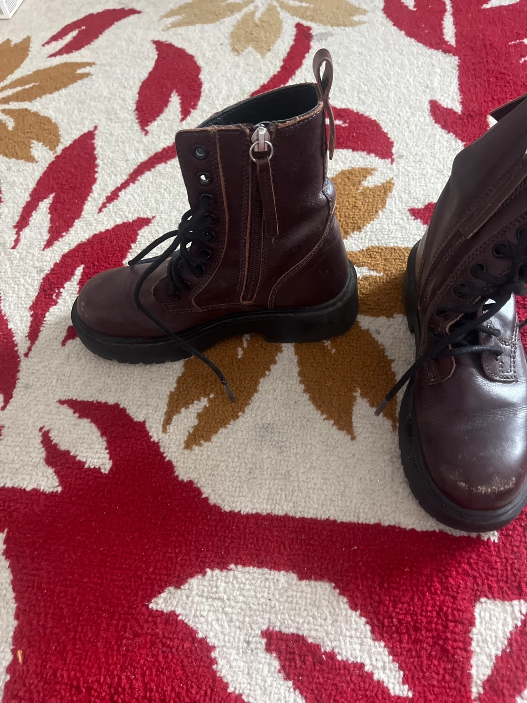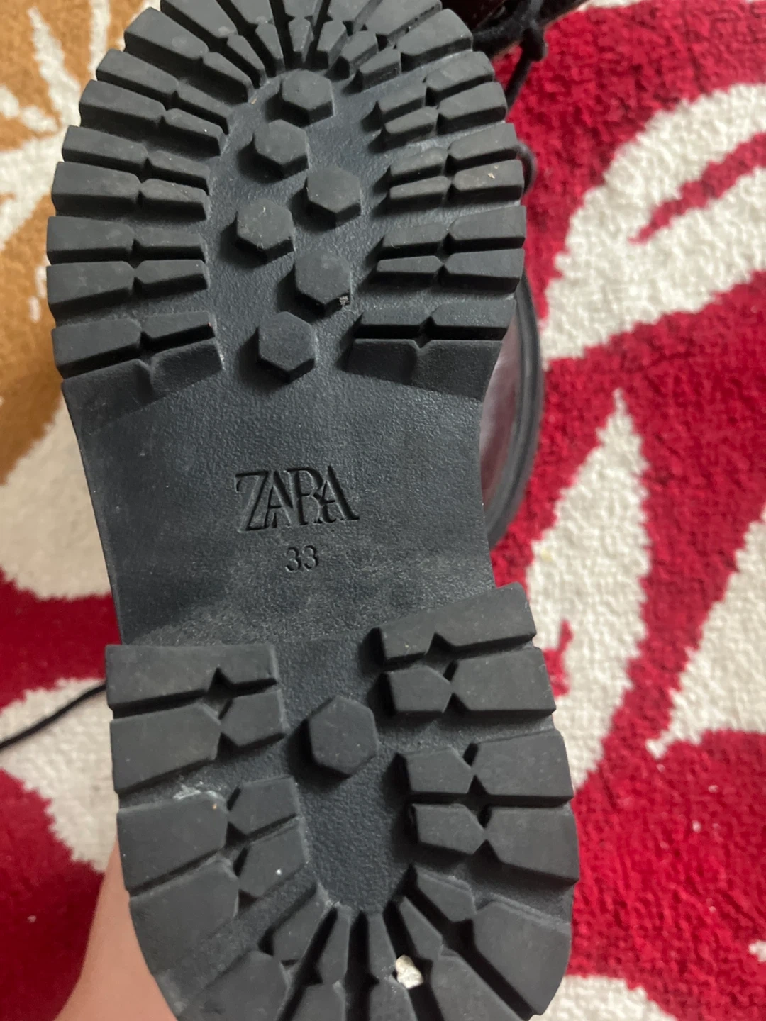 These brown leather boots from Zara feature a lace-up front and a side zipper for easy on and off. They're a size 33, perfect for little feet. The durable sole is ready for everyday adventures!