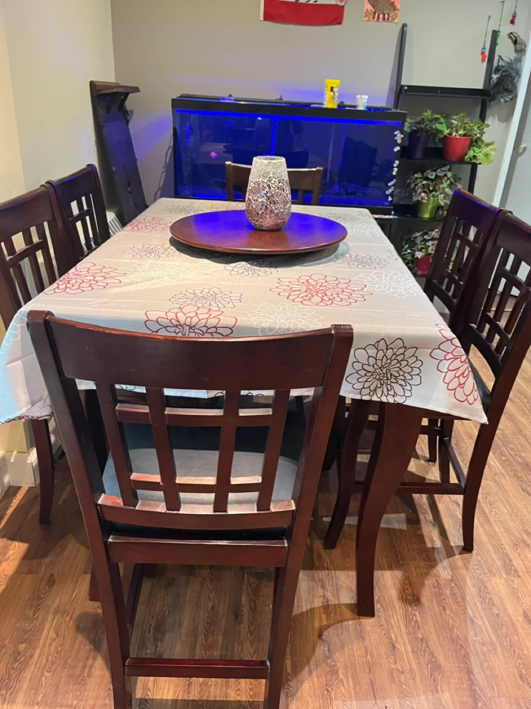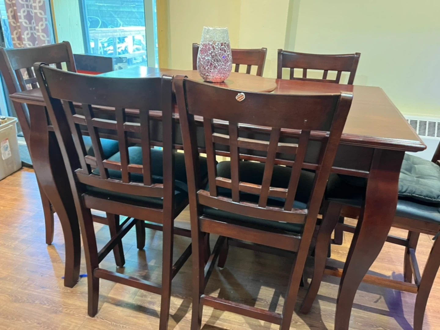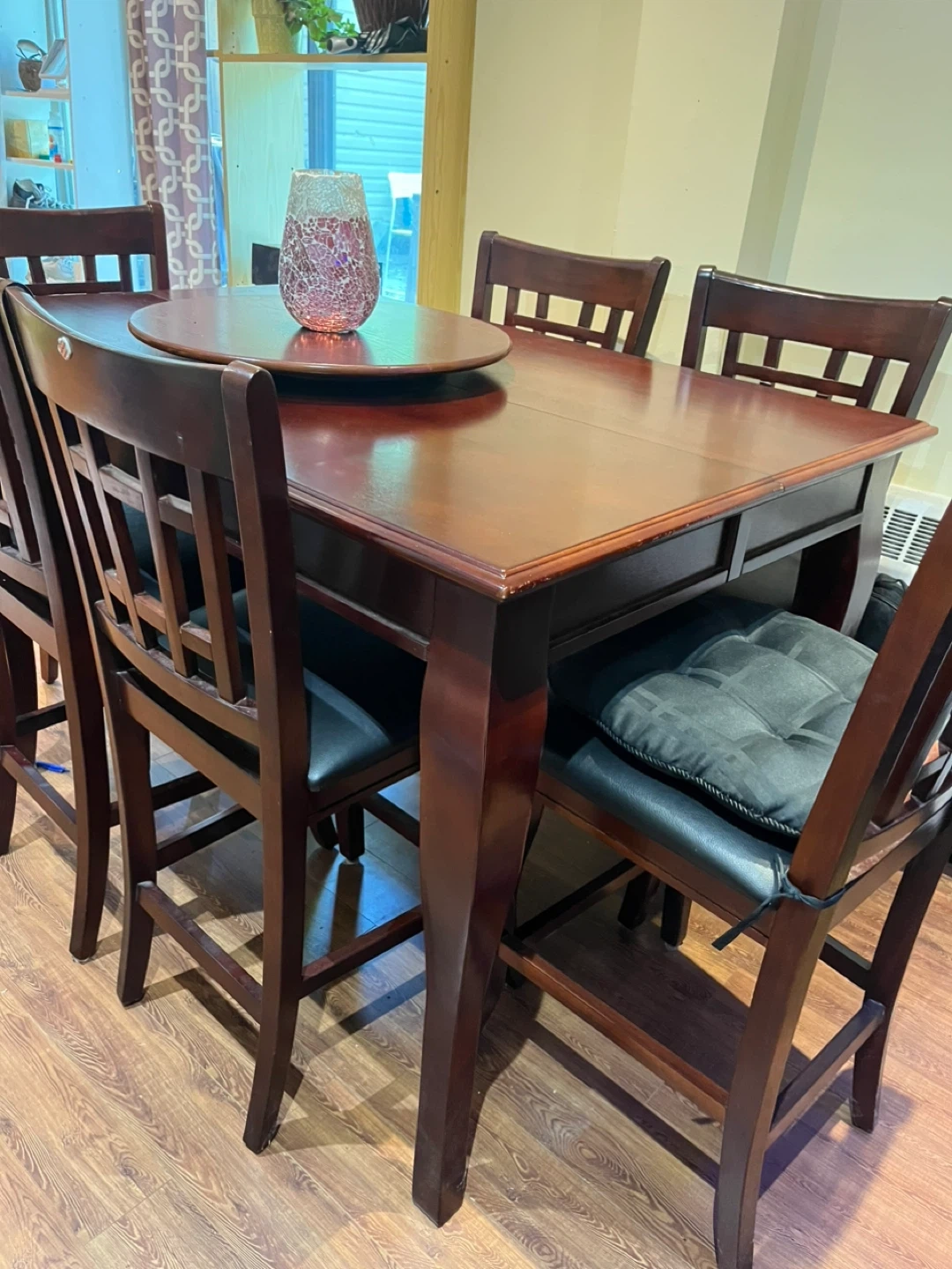 A sturdy wooden dining table set perfect for family meals. It comes with six chairs featuring comfortable black upholstered seats. The table has a smooth, dark wood finish,it has an extra piece for extending to 8,also with Suzan Tray.