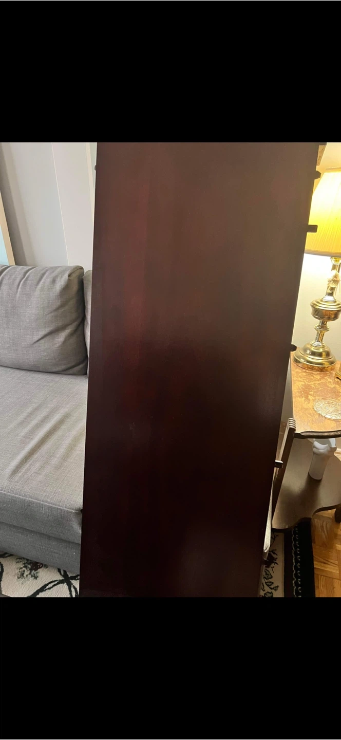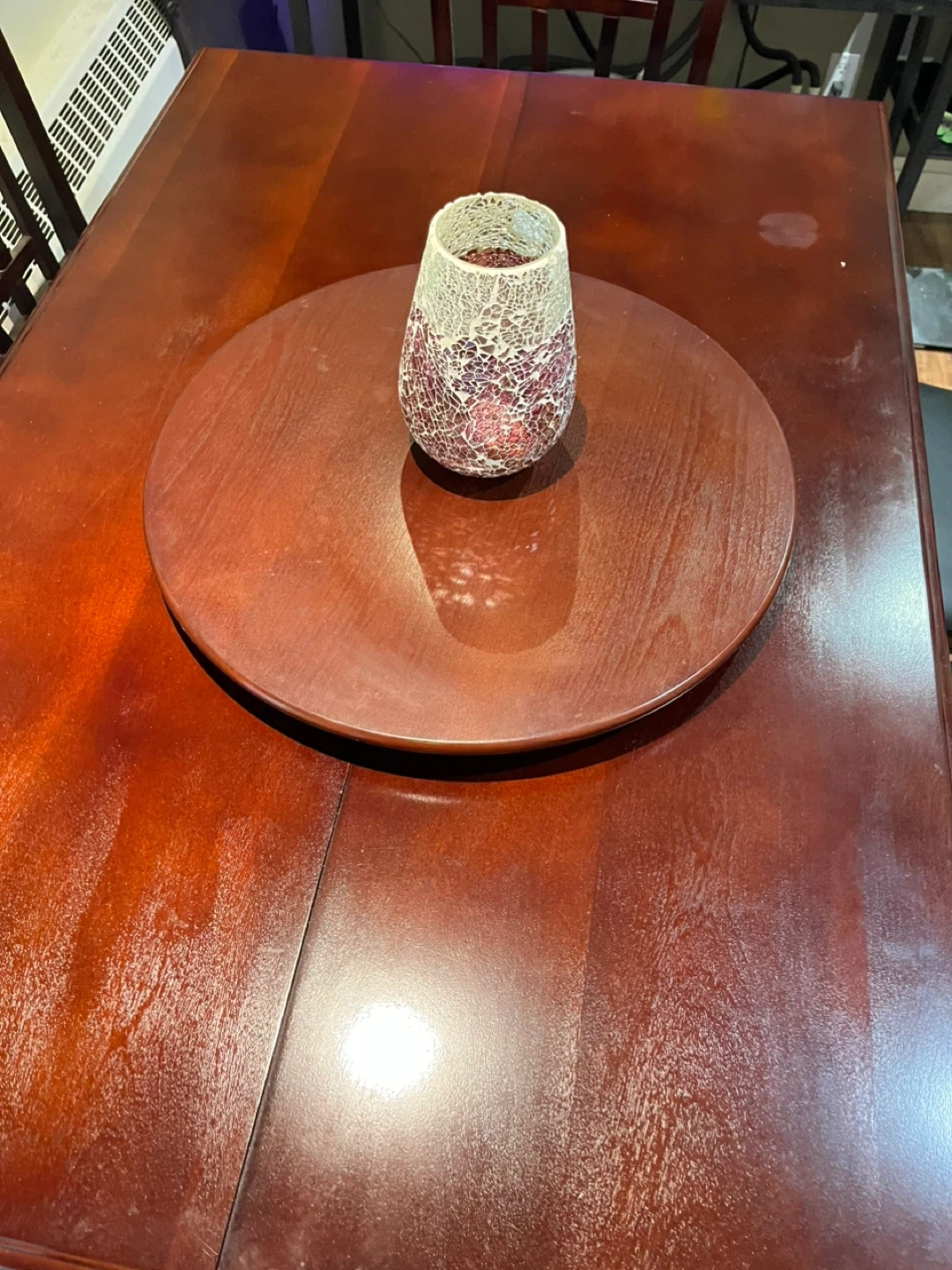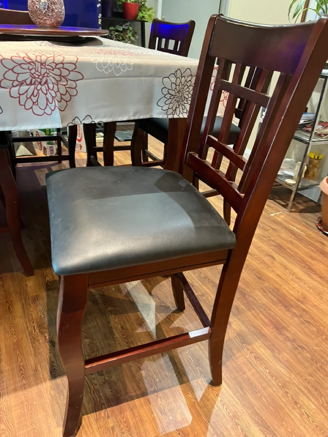 A sturdy wooden dining table set perfect for family meals. It comes with six chairs featuring comfortable black upholstered seats. The table has a smooth, dark wood finish,it has an extra piece for extending to 8,also with Suzan Tray.