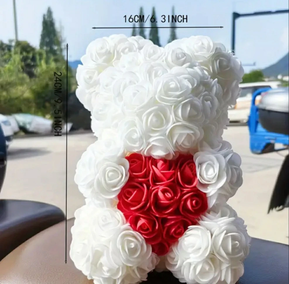 This rose bear is crafted from artificial roses and features a heart design on the chest. It stands 24cm (9.5 inches) tall with a width of 16cm (6.3 inches). A perfect decorative piece for any occasion!