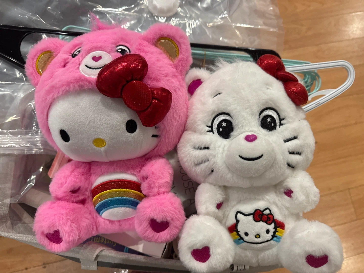 Two plush toys featuring a collaboration between Care Bears and Hello Kitty. One is a pink bear with a rainbow belly, dressed as Hello Kitty. The other is a white cat-like bear with a Hello Kitty emblem and rainbow stripes on its chest. Both have red bows.