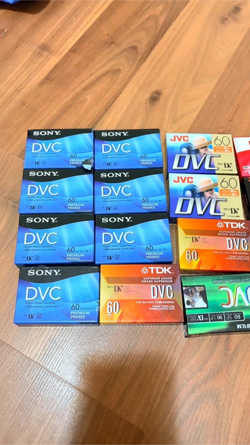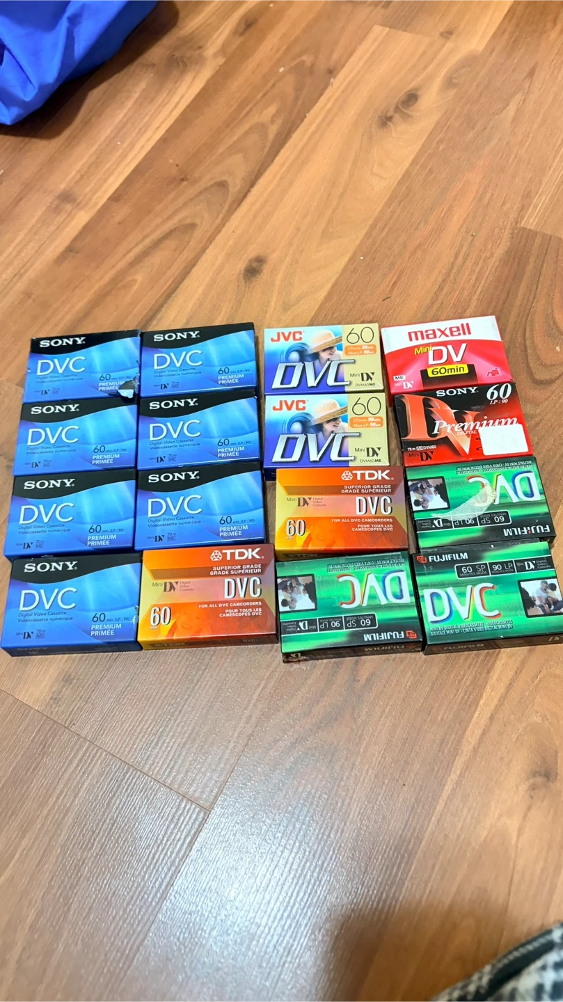 Selling a brand new bundle of 16 DVC mini DV tapes. Includes Sony DVC 60 Premium Primee tapes, JVC 60 mini DV tapes, Maxell 60 min DV tapes, TDK DVC 60 Premium tapes, and Fujifilm DVC 90 tapes. These are digital video cassettes for camcorders. $7 each