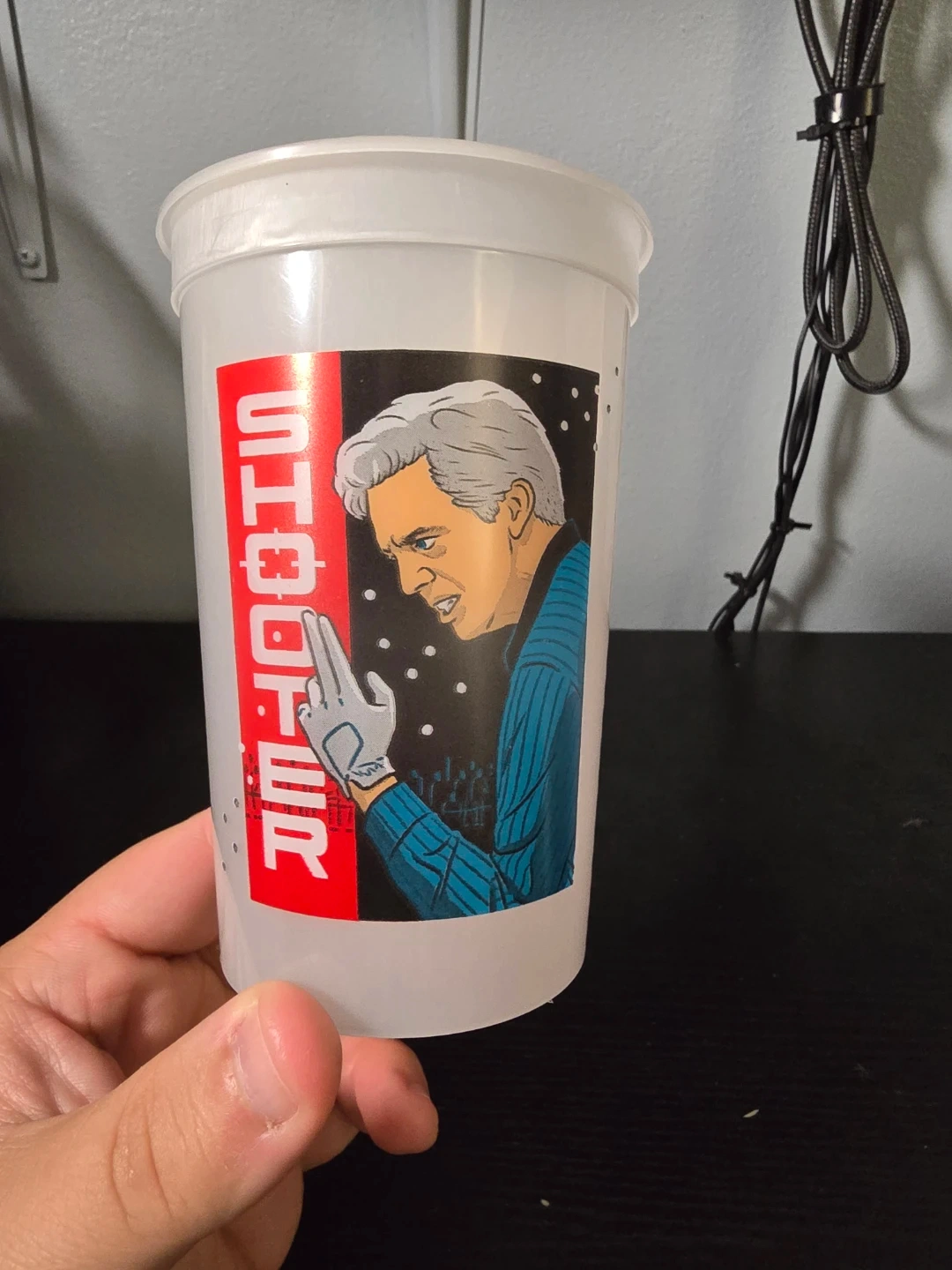 This is a plastic cup featuring a character graphic and the word 'Shooter' on the side. Made of clear plastic. It's a reusable cup.