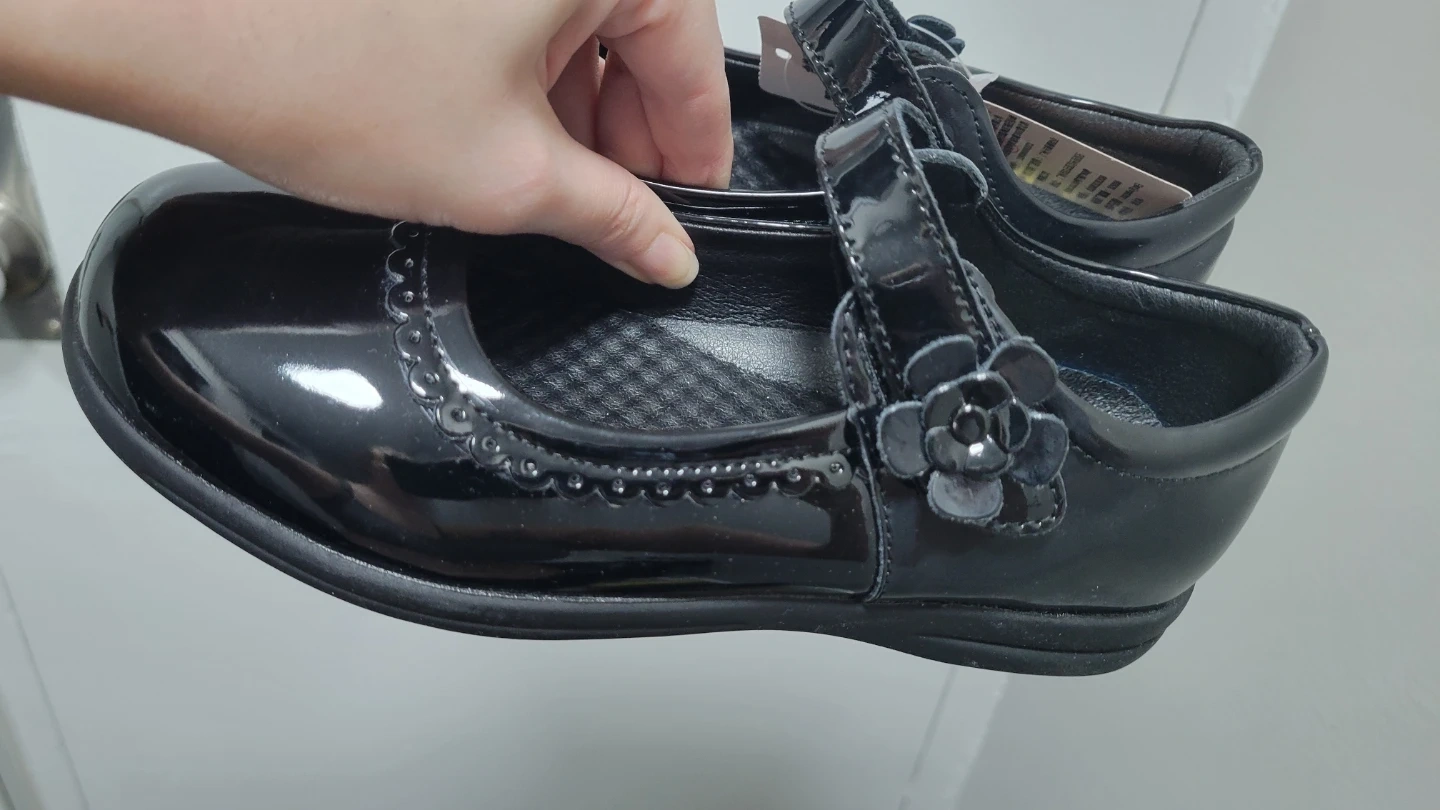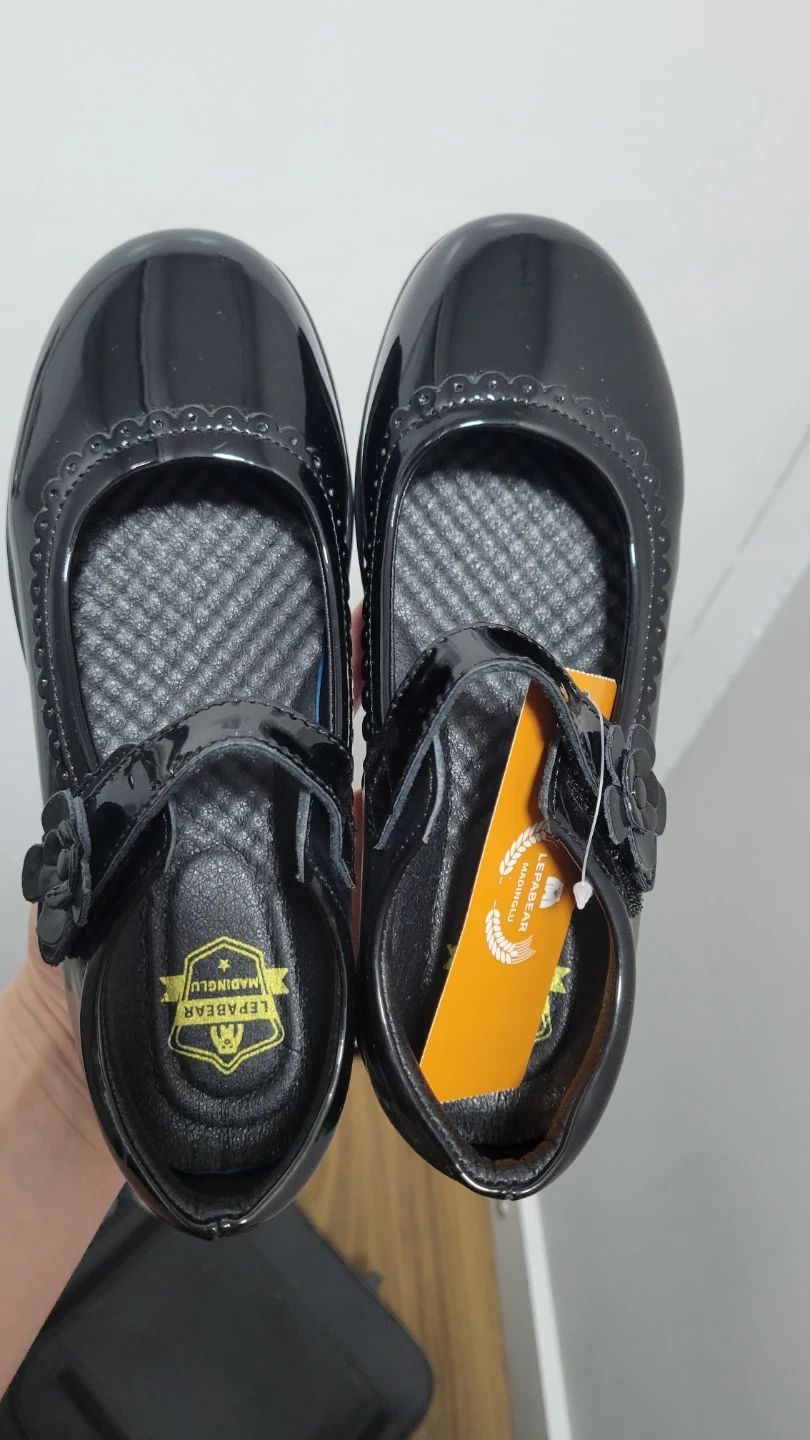 These are shiny black patent leather Mary Jane style shoes, perfect for school. They feature a convenient strap closure and a decorative flower detail on the front. The soles are marked with 'British Style Black Shoes School Designated' and size 35.