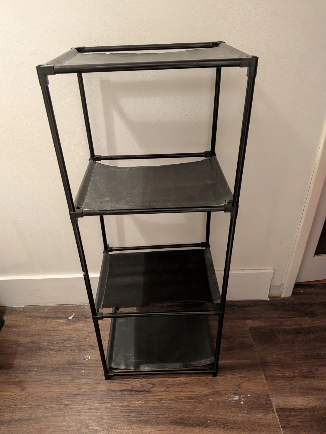 This is a 4-tier shelf unit with a black fabric finish. It's made of metal tubing and fabric shelves. This unit's easy assembly makes it useful for storing various items around the home.