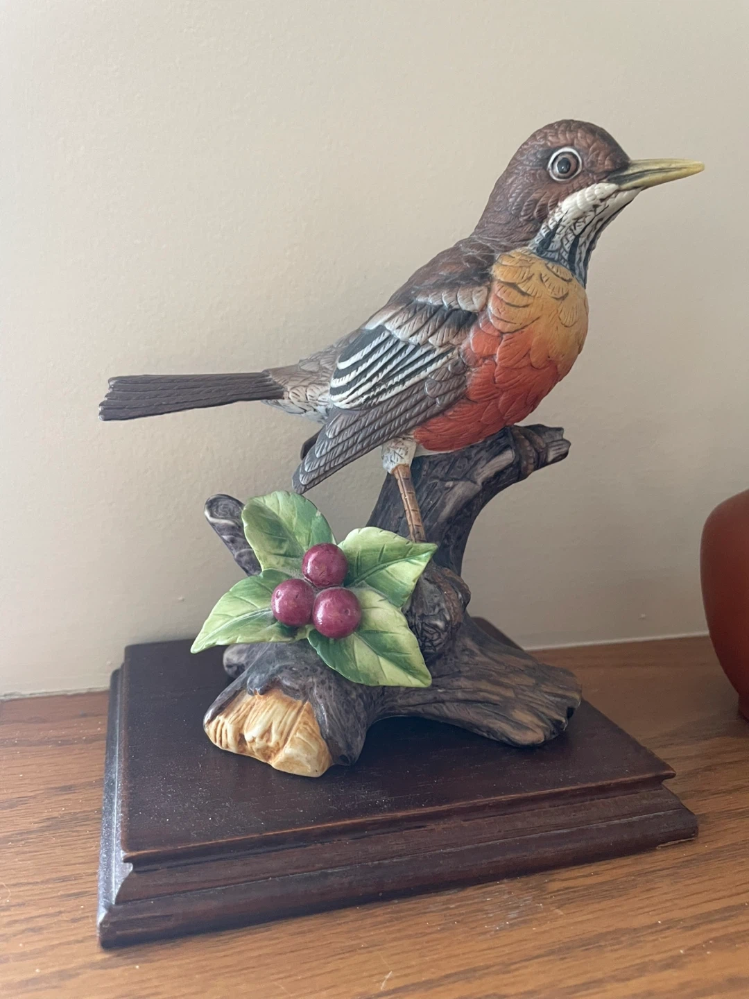 Ceramic Robin Figurine with Berries on Wooden Base