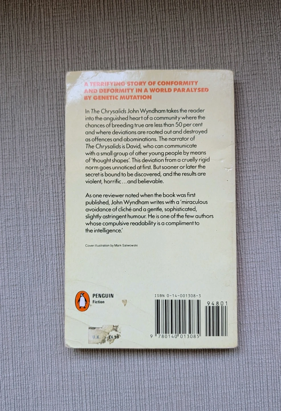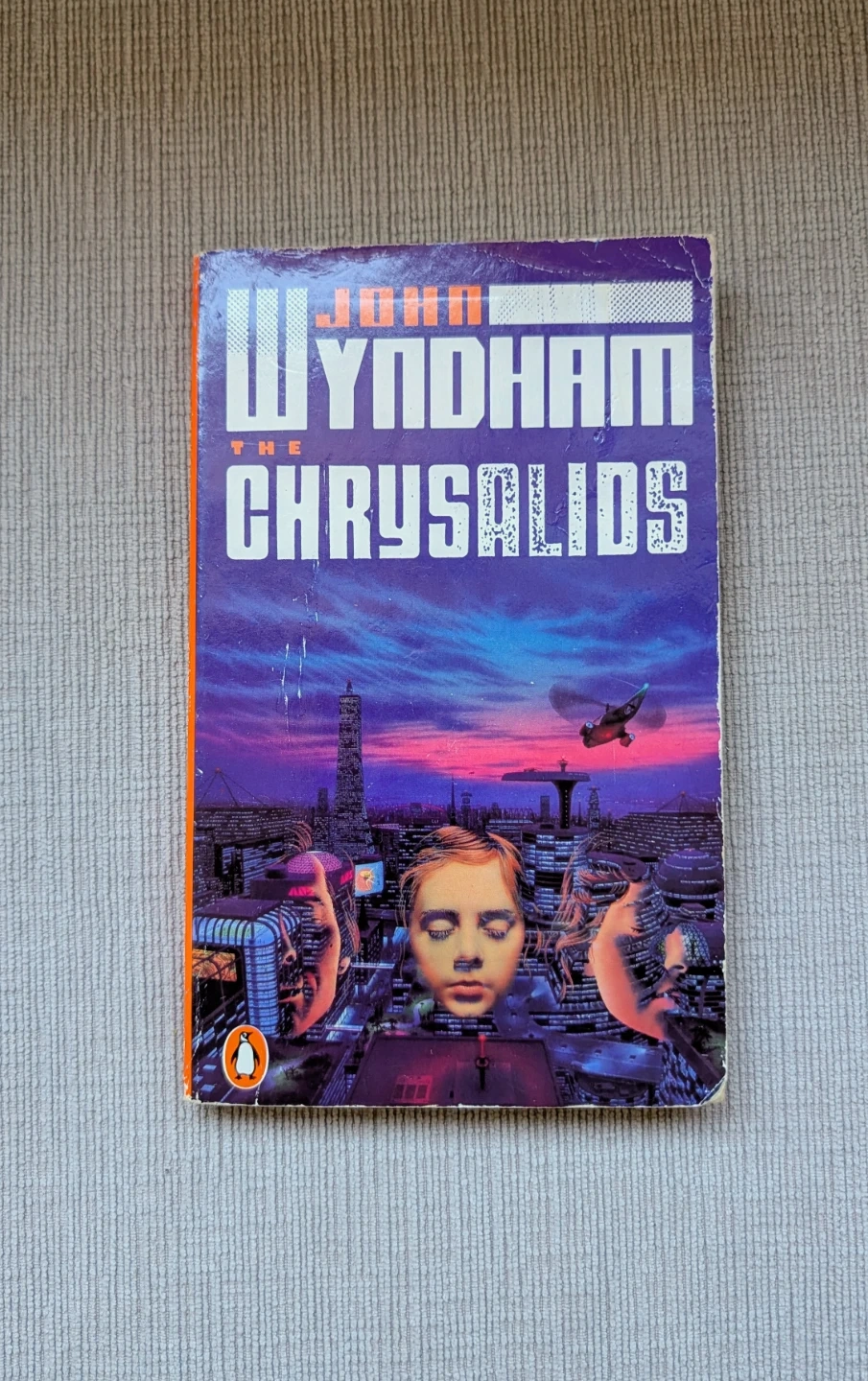 This is John Wyndham's "The Chrysalids" paperback novel. It's a work of fiction published by Penguin. The book explores themes of conformity and mutation in a post-apocalyptic society.