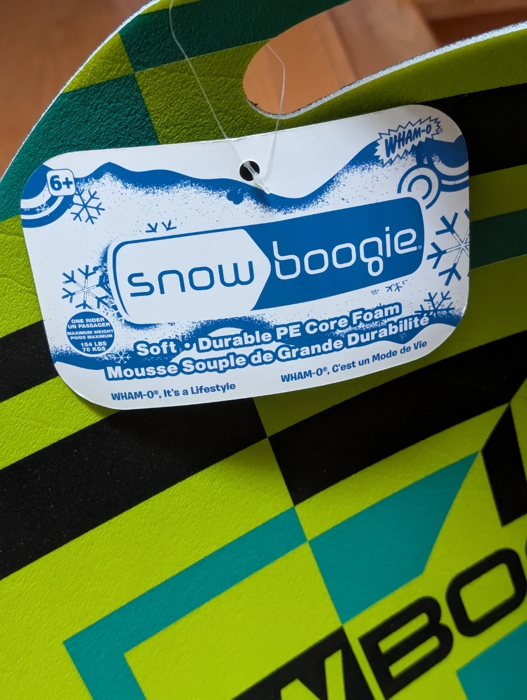 This Snow Boogie sled is made from soft, durable PE Core Foam. It's designed for winter fun and can support up to 150 lbs. Recommended for ages 6 and up.