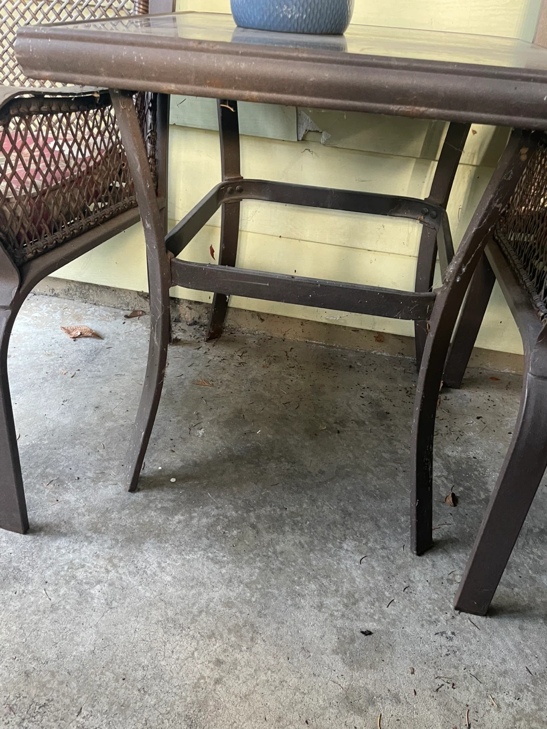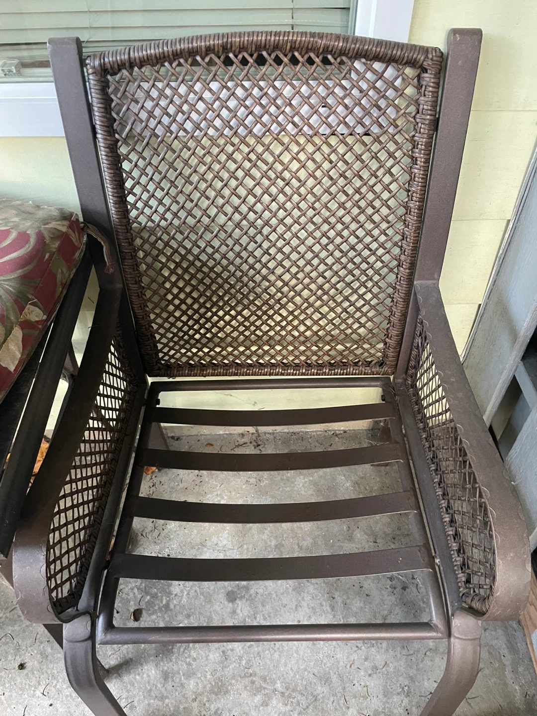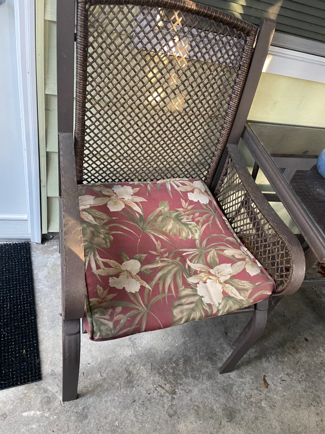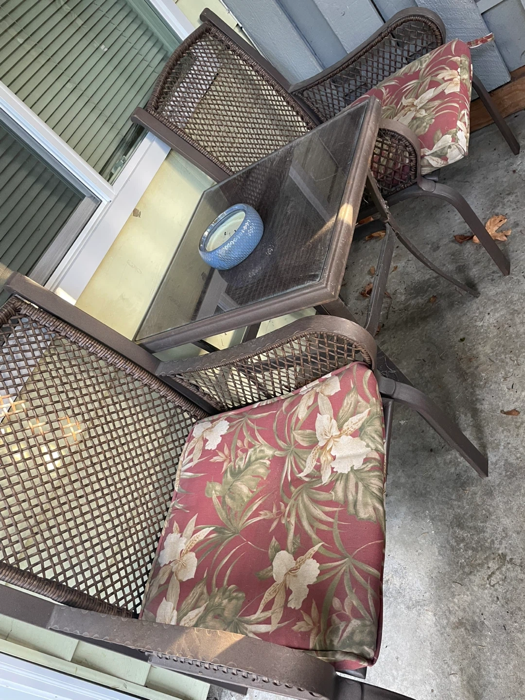 Selling a charming outdoor patio set! It comes with two chairs that have comfy floral cushions and a glass-topped table. The chairs have a lovely woven design, and the table is perfect for drinks or snacks while you enjoy the outdoors