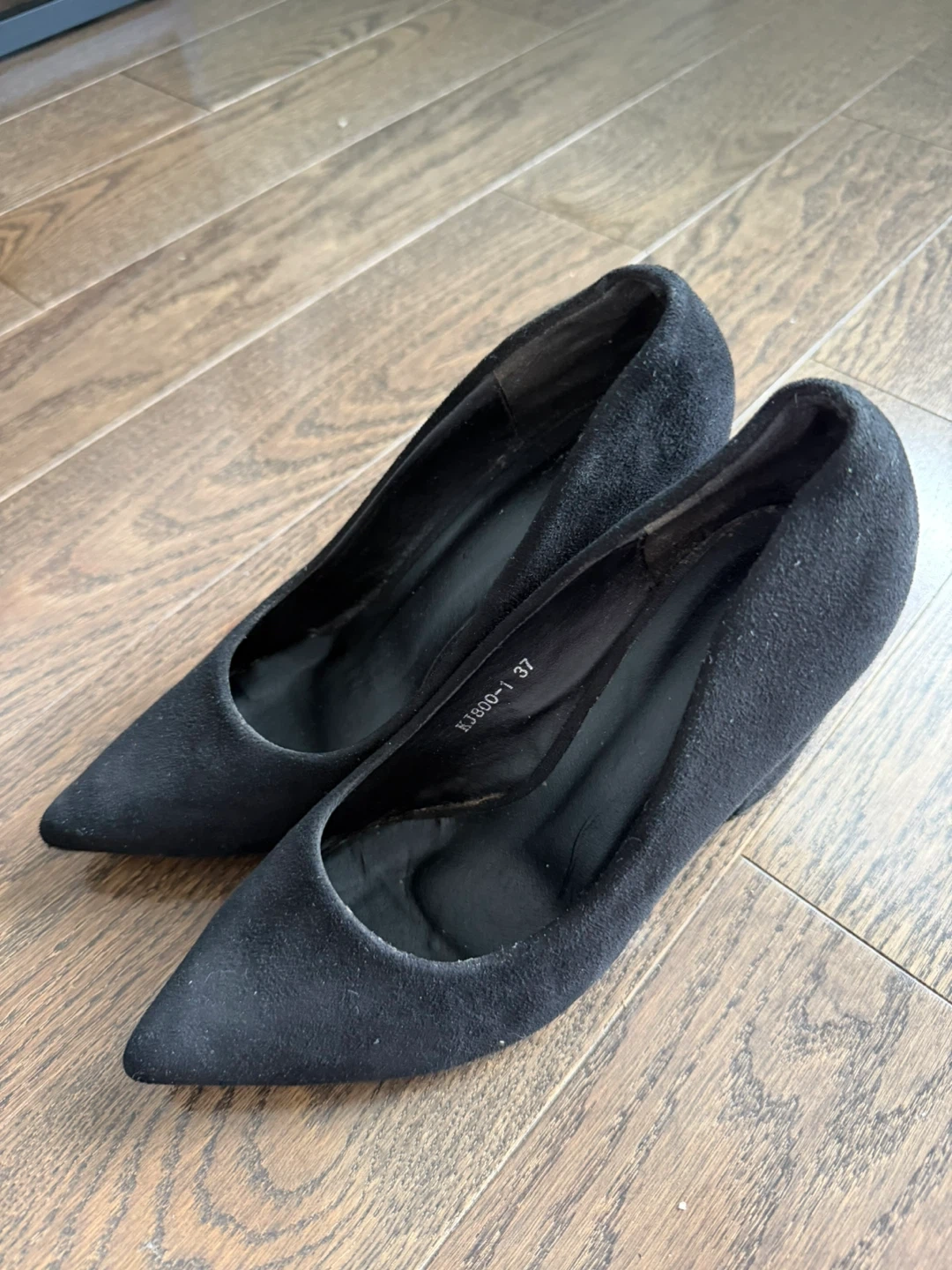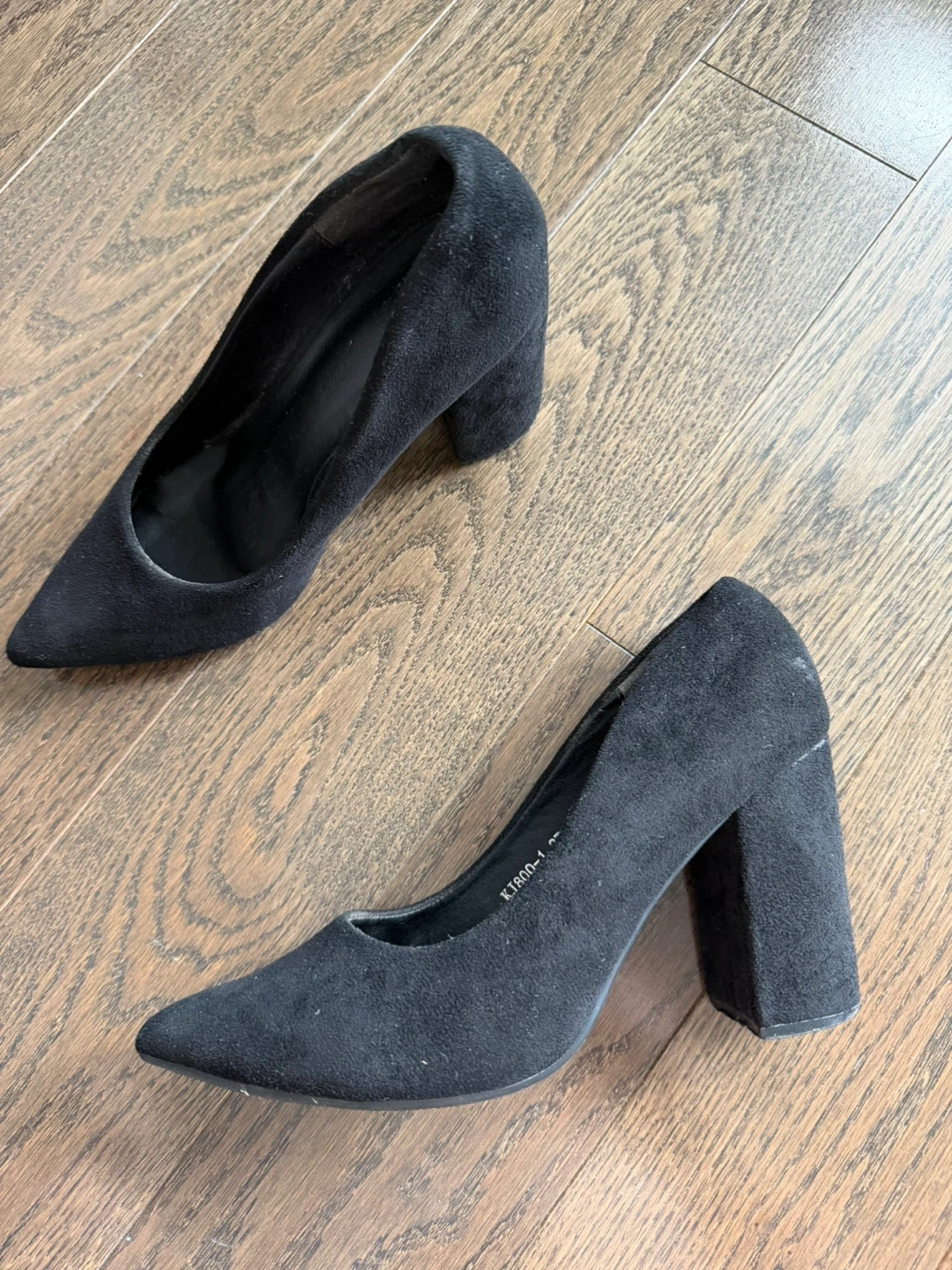 Stylish black suede block heels. These shoes are a European size 37. They've got a chic pointed toe and a comfortable block heel. Dress 'em up or down!