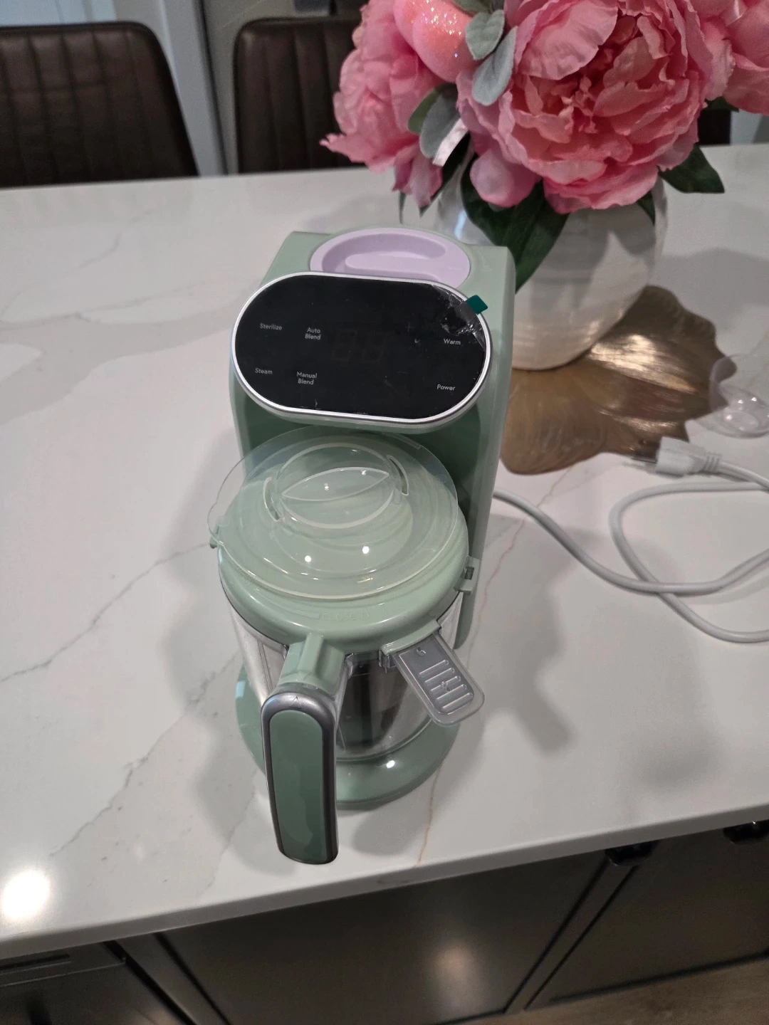 This baby food maker steams and blends food for your little one. It steams, auto-blends, sterilizes, and warms. Making homemade baby food is easy with this appliance. It's a great kitchen helper for parents!