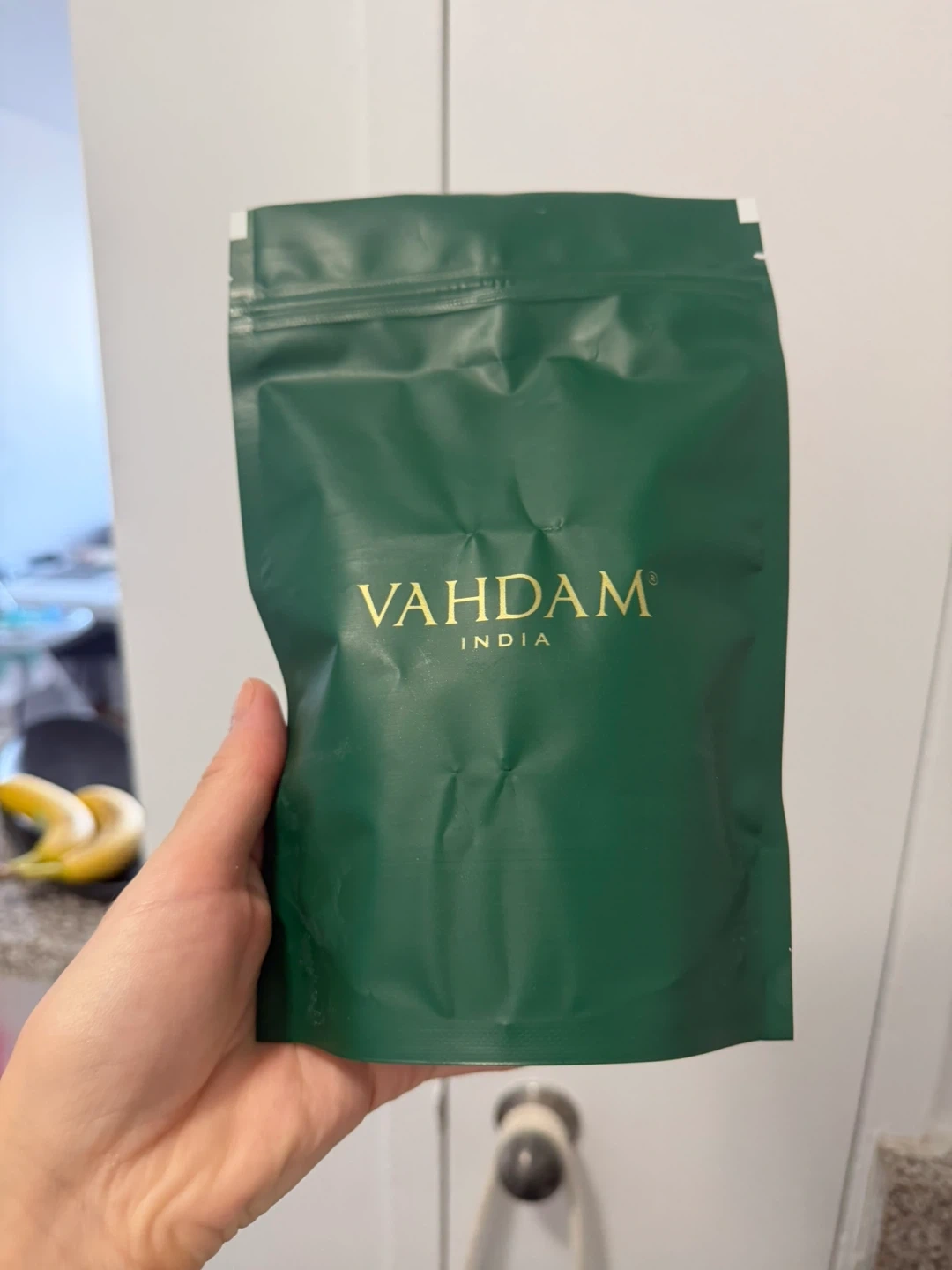 This is a bag of VAHDAM INDIA Darjeeling Premium First Flush Black Tea. It contains caffeine and is packed at source in India. Enjoy a delicious cup of tea! 100 grams