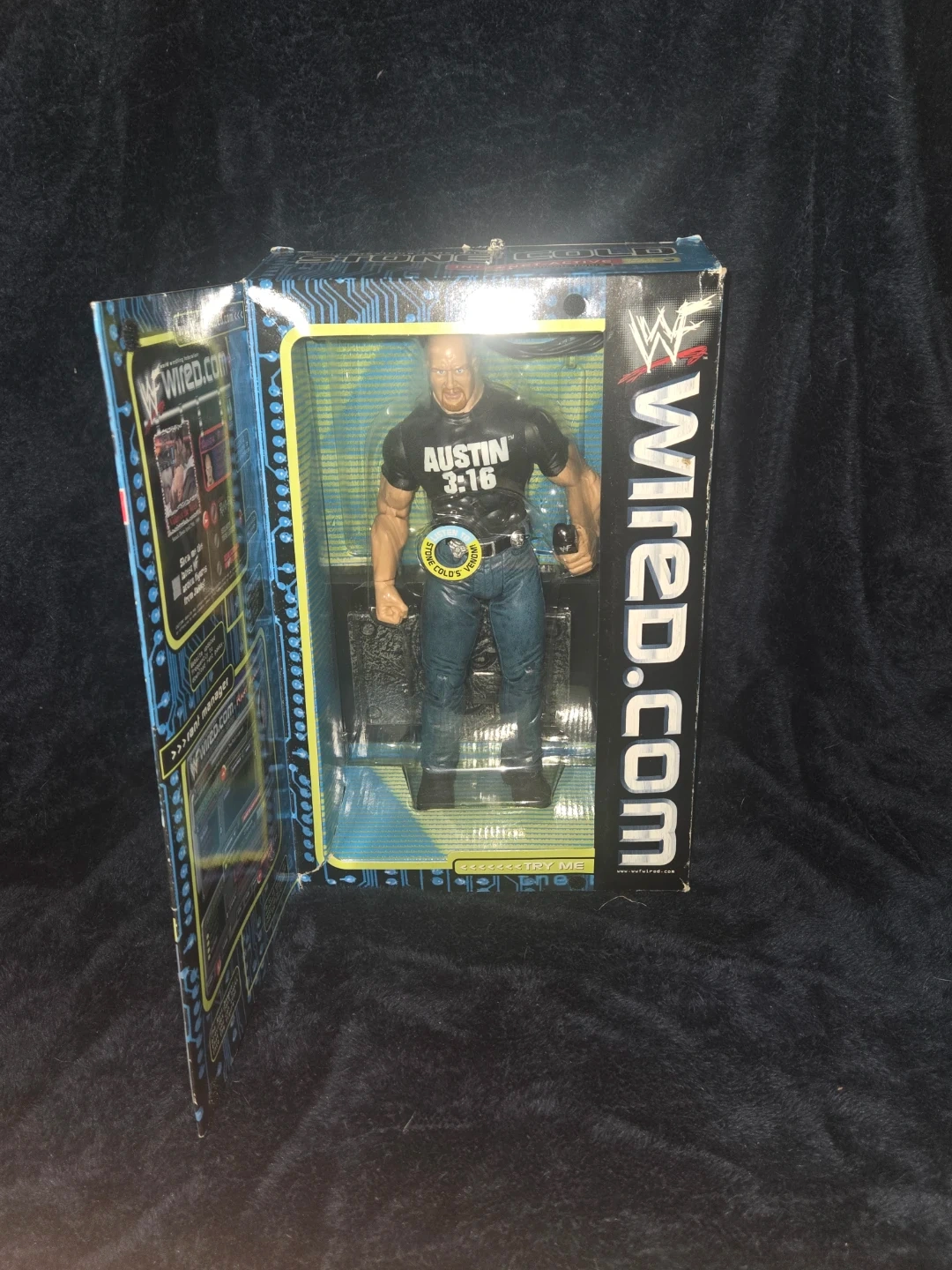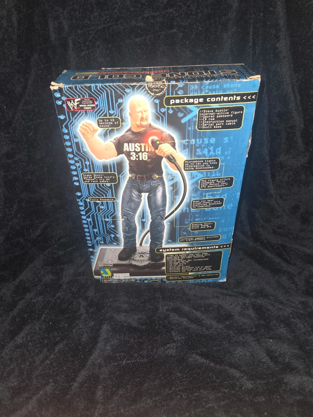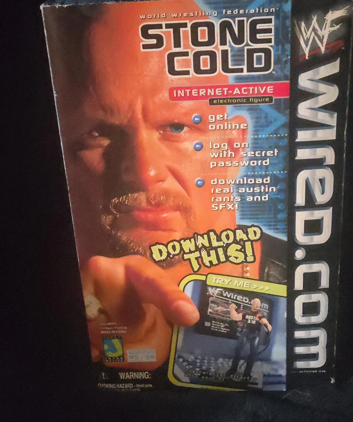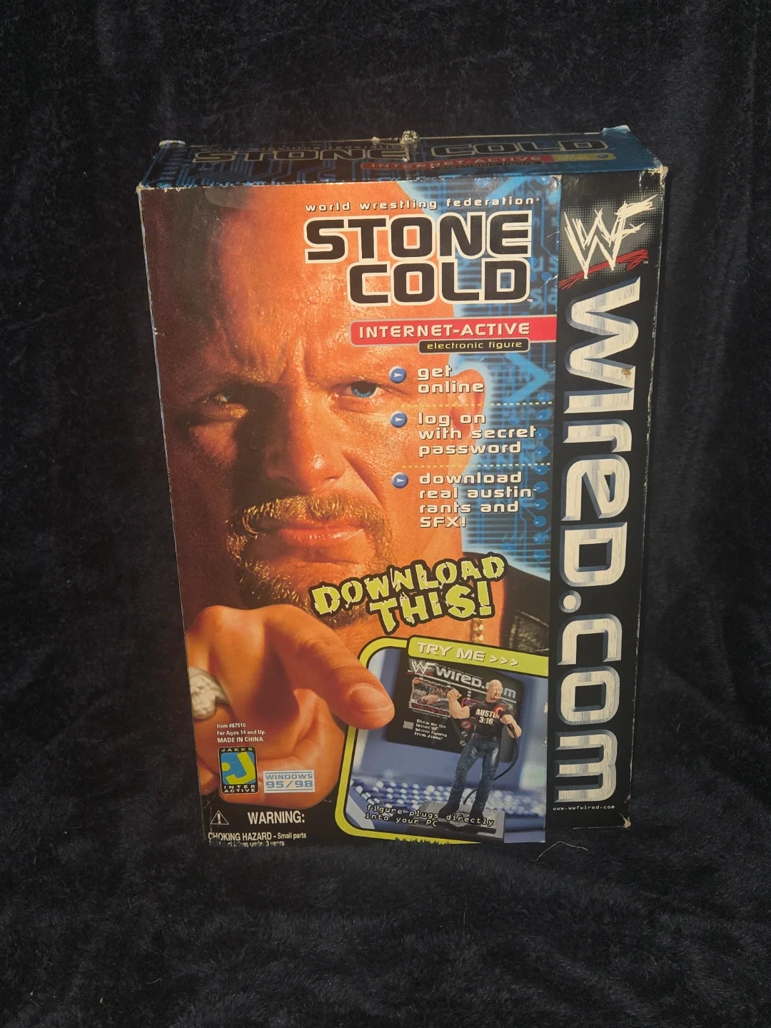 This is a "Stone Cold" Steve Austin "Internet-Active" electronic figure from the World Wrestling Federation. It comes with the original figure, secret password, serial port cable, and manual. The figure offers realistic sound effects and action when connected to your PC.